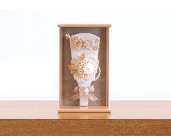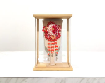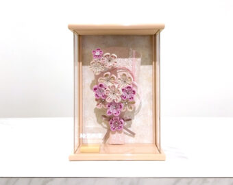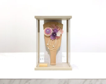コンパクトな壁掛けタイプの羽子板です。羽子板に丁寧にに施されたつまみ細工のお花は正絹を使用した上品な質感と風合いが美しく、ケースは軽く破損の危険が少ないアクリルケースを採用しております。