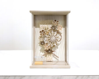 ゴールドとベージュを基調とした上品で華やかな雰囲気漂う羽子板です。つまみ細工のお花は取り外してお子様の御祝い事用の髪飾りとしても使用できます。壁掛けタイプの羽子板で、壁に掛けても良し、置いて飾っても良しと飾る場所を選ばずお祝いができます。