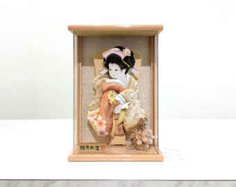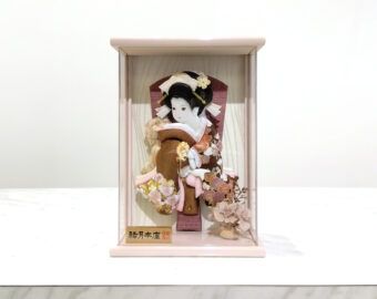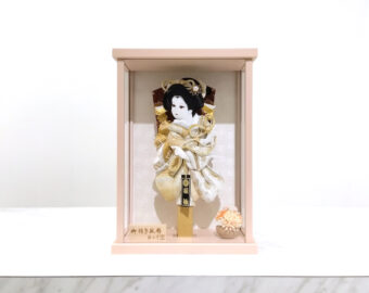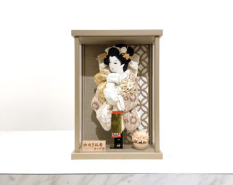 明るく華やかなゴールドと白の御衣裳の羽子板です。板色がシックなブラウンになっており華やかな御衣裳をより際立たせています。優しいピンク色のケースは壁掛けタイプになっており、壁に掛けたり置いて飾ったりと様々な場所にお飾りいただけます。