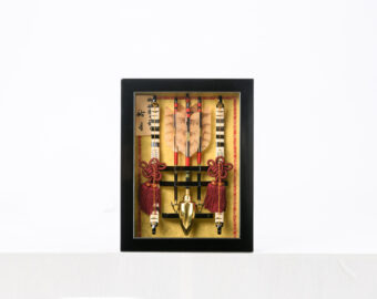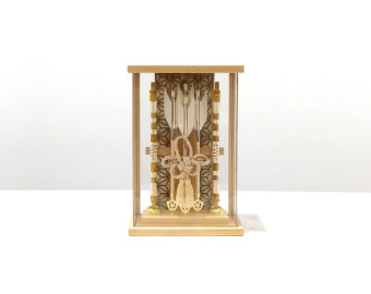 コンパクトに飾れる壁掛けタイプの破魔弓です。弓矢の背景には職人の技巧が光る組子細工が施されておりナチュラルな暖かみのある白木のケースと相まって伝統とモダンが見事に融合した破魔弓となっています。