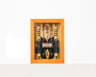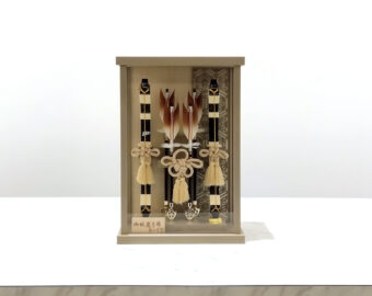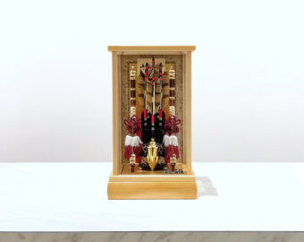 コンパクトながらも矢にはフクロウ羽根を使用、中央の矢の矢じりには純金箔が張られた高級感ある破魔弓です。落ち着いた白木ケースが破魔弓をより上品に引き立てています。