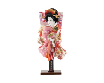 サーモンピンクとベージュを基調に優しく落ち着いた雰囲気の漂う羽子板です。壁掛けタイプの羽子板で、壁に掛けても良し、置いて飾っても良しと飾る場所を選ばずお祝いができます。