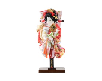 明るく華やかなゴールドと白の御衣裳の羽子板です。板色がシックなブラウンになっており華やかな御衣裳をより際立たせています。優しいピンク色のケースは壁掛けタイプになっており、壁に掛けたり置いて飾ったりと様々な場所にお飾りいただけます。