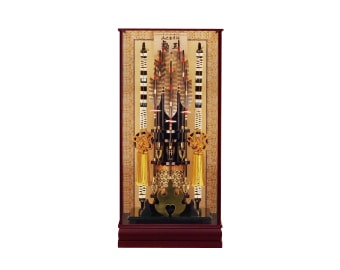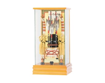 コンパクトながらも矢にはフクロウ羽根を使用、中央の矢の矢じりには純金箔が張られた高級感ある破魔弓です。落ち着いた白木ケースが破魔弓をより上品に引き立てています。