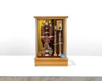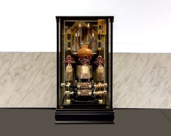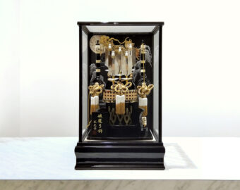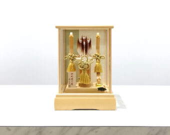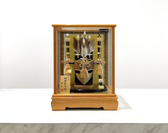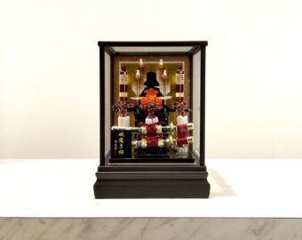 コンパクトながらも弓矢と大小の太刀の入った豪華な仕様の破魔弓です。ケースにはアクリルを使用し、落ち着いた風合いの美しい木目ケースになっています。