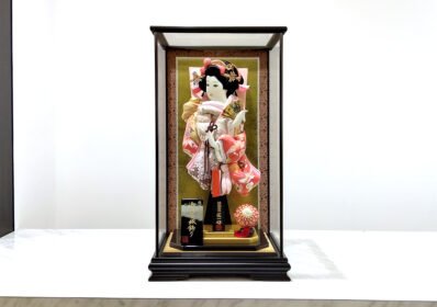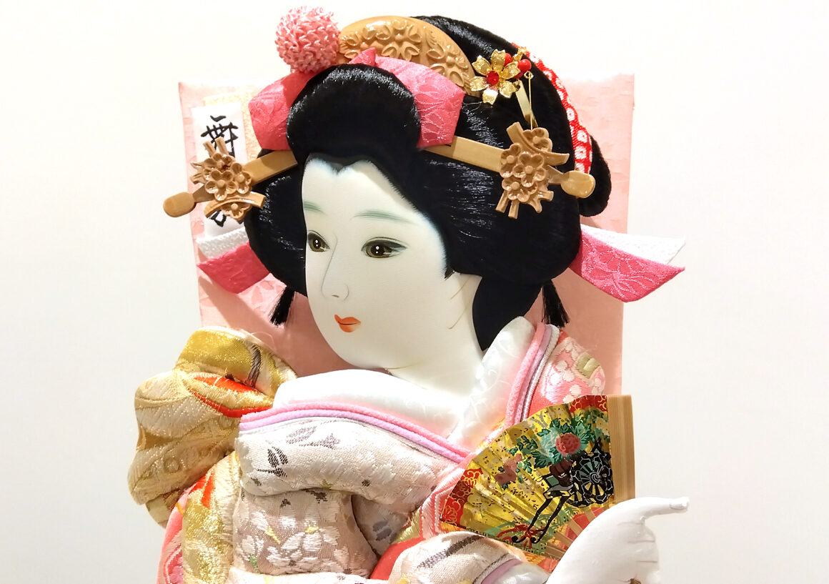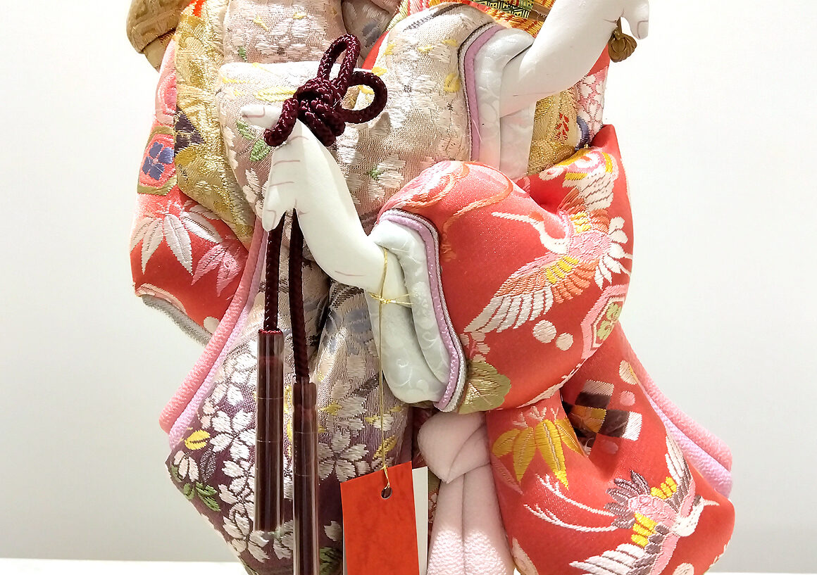 御衣裳は正絹造りになっており、独特の艶と柔らかい質感が非常に上品な羽子板です。御衣裳には縁起物の鶴が大きく描かれ女の子の初正月の御祝いにふさわしい飾りになっています。