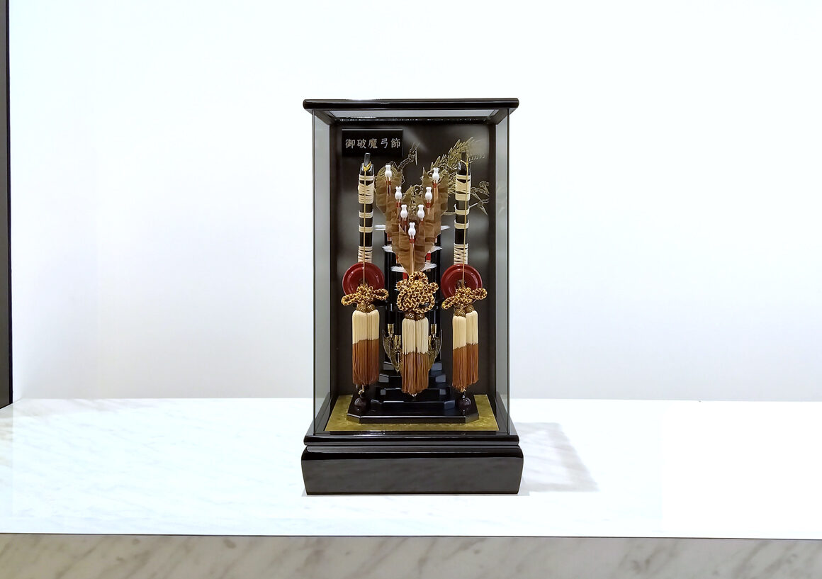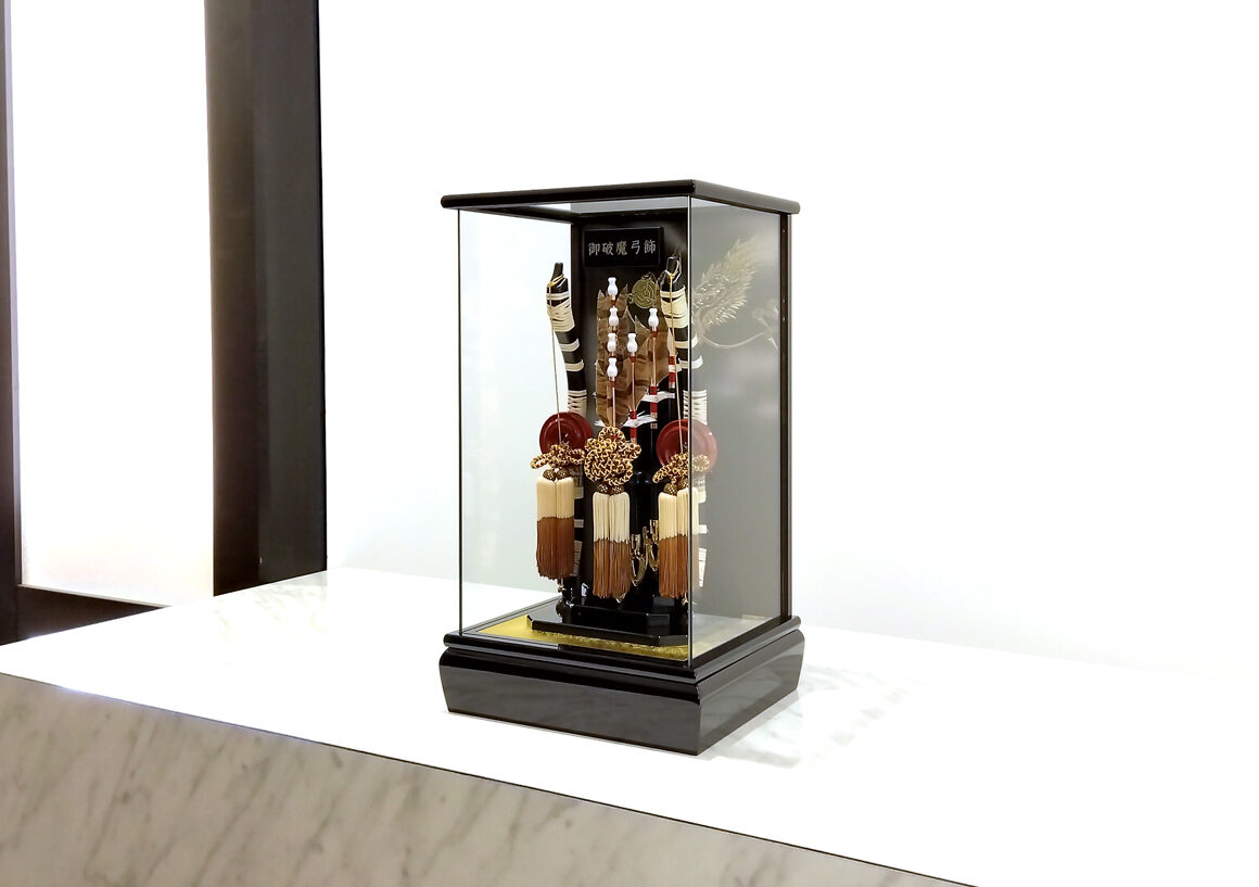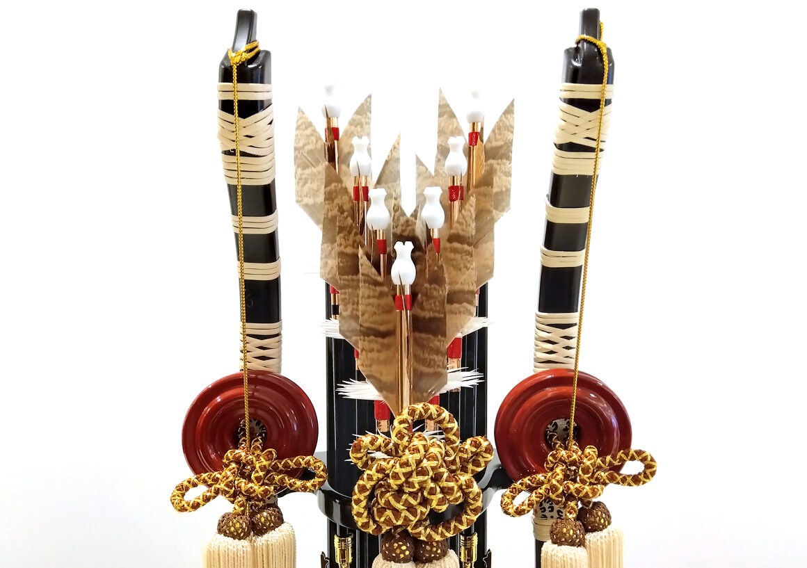 左右の柱のないすっきりとしたデザインのケースに矢には縁起の良いふくろうの羽根を使用しています。ふくろうは「不苦労」や「福来郎」と当て字され、苦労せず福が来るという意味を持った縁起物の鳥になります。お子様の初正月にぴったりの破魔弓です。
