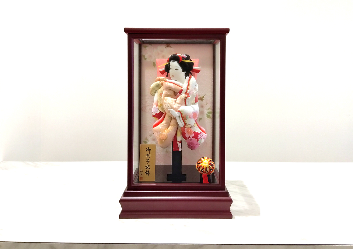 より立体感が感じられる六角形のケースとまさに優雅に舞う躍動感のあるポージングが特徴的な羽子板です。御衣裳は正絹を使用し落ちついた艶がありながらも大小さまざまな花が咲き誇り、華やかな飾りとなっています。