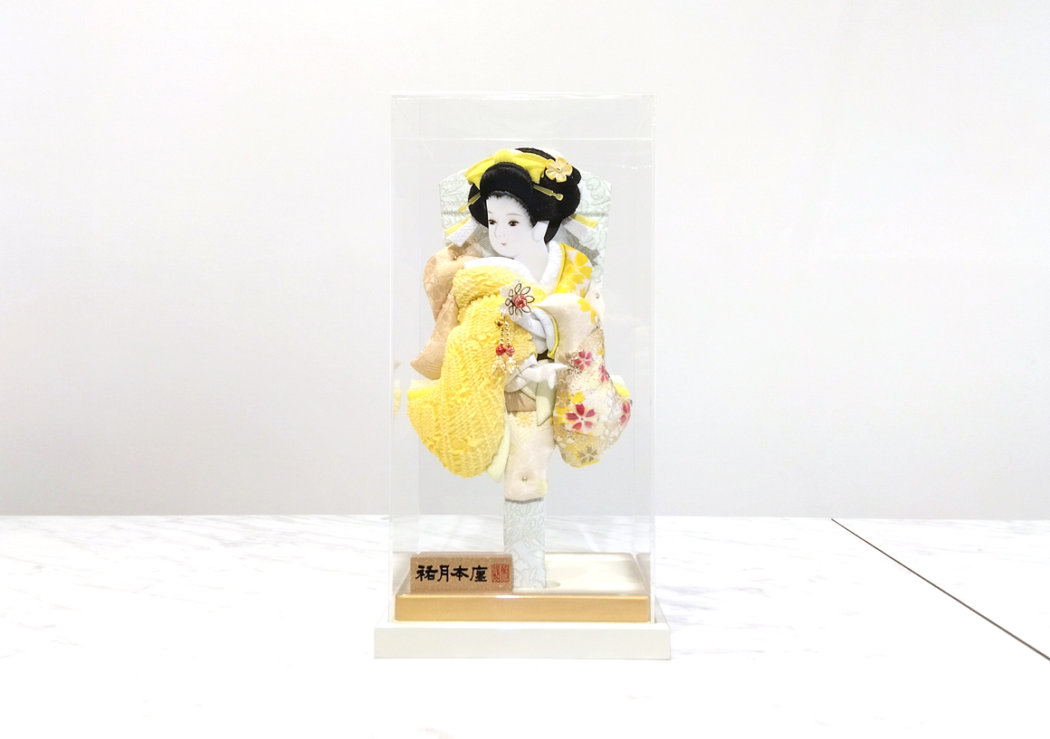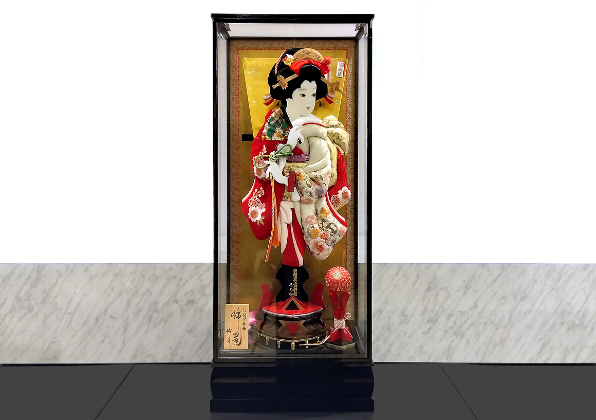 御衣裳に正絹の帯地を用いた豪華な高級感溢れる羽子板です。黒塗りのケースが華やかな羽子板を引き締めより際立たせています。御祝い物にふさわしい羽子板です。