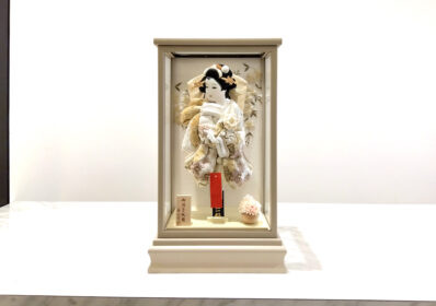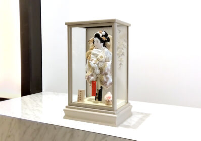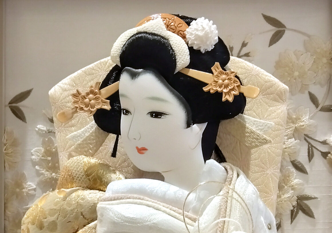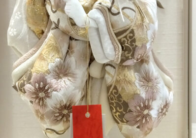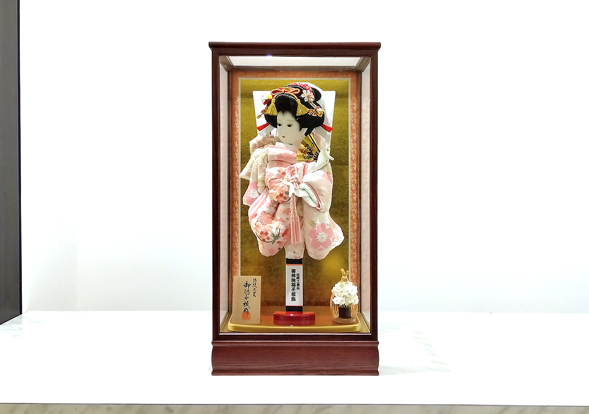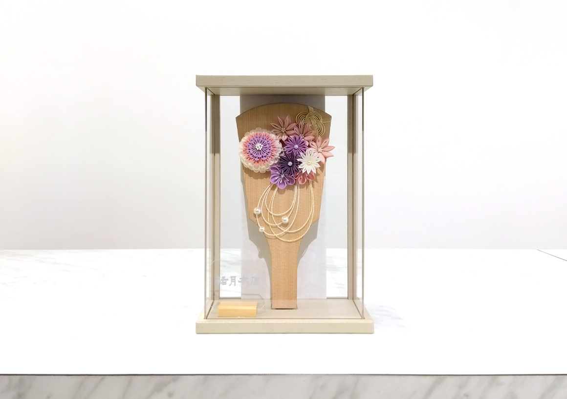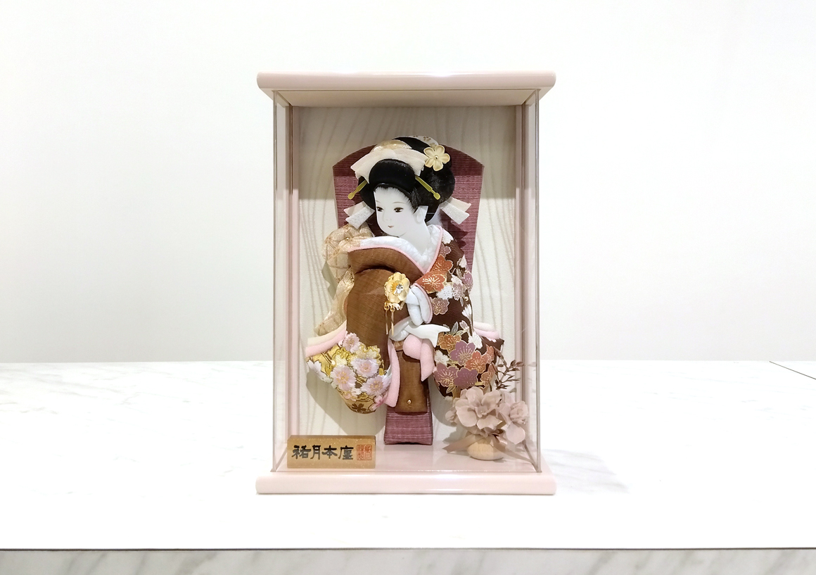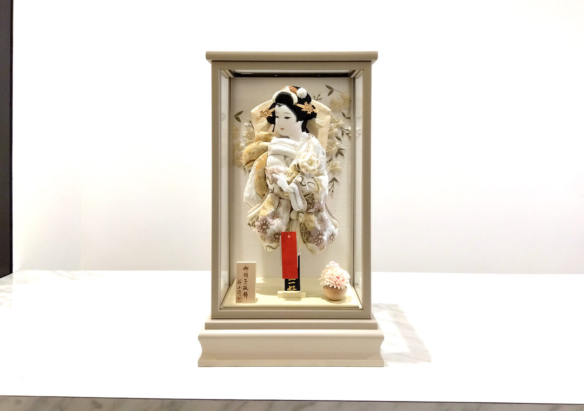 数十の糸を使い緻密に針を入れた刺繍の美しさが着物を華やかに彩ります。手にはつまみ細工の花を持った上品な色合いの羽子板です。