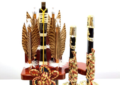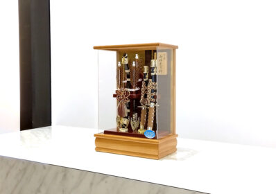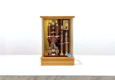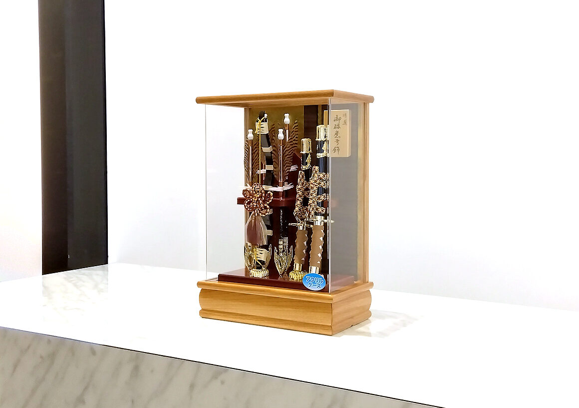 コンパクトながらも弓矢と大小の太刀の入った豪華な仕様の破魔弓です。ケースにはアクリルを使用し、落ち着いた風合いの美しい木目ケースになっています。