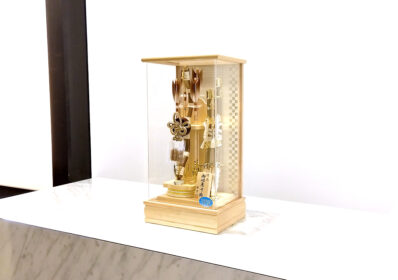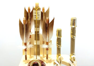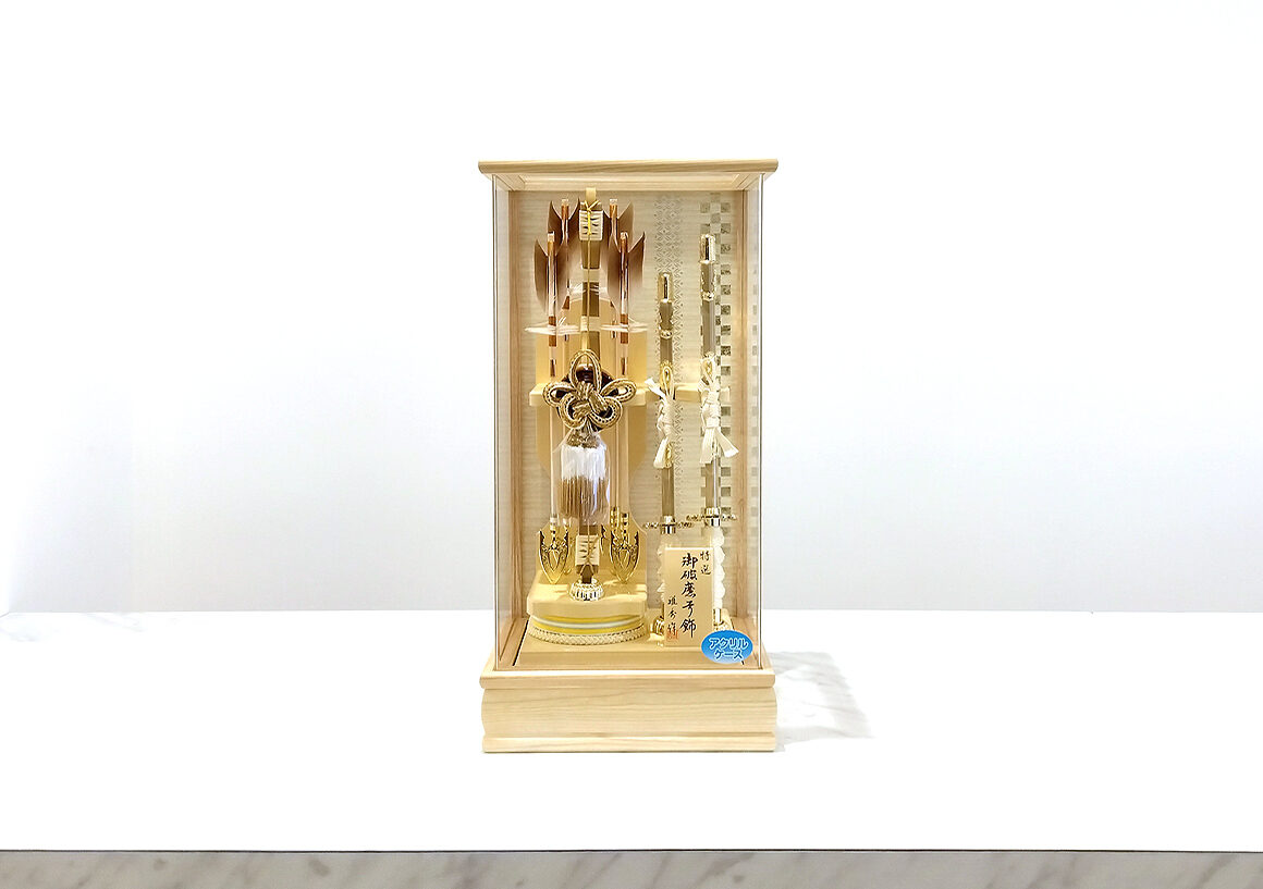 金塗の弓と白木の矢に、長く豪華な二振りの太刀を白木の木目ケースに合わせ、上品で神聖さすら感じる破魔弓です。アクリルケースになっており、軽く壊れづらいのが特徴です。