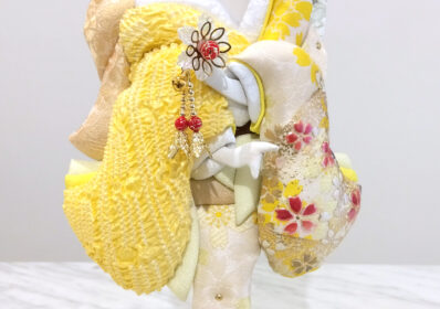 絞り染めの御衣裳は正絹生地を使用、コンパクトなアクリルケース入りで様々な場所に飾れます。黄色は幸運や希望を象徴し、お子様の初正月のお祝いにふさわしい飾りです。