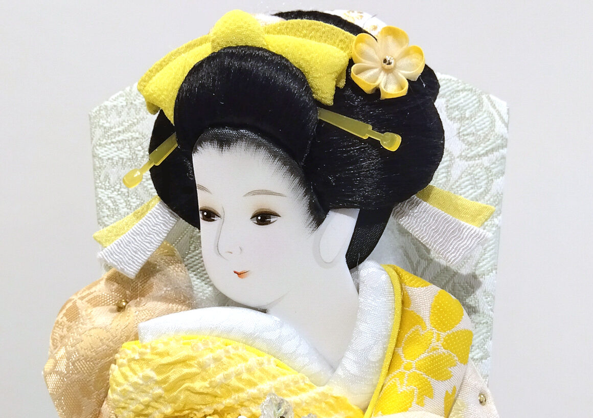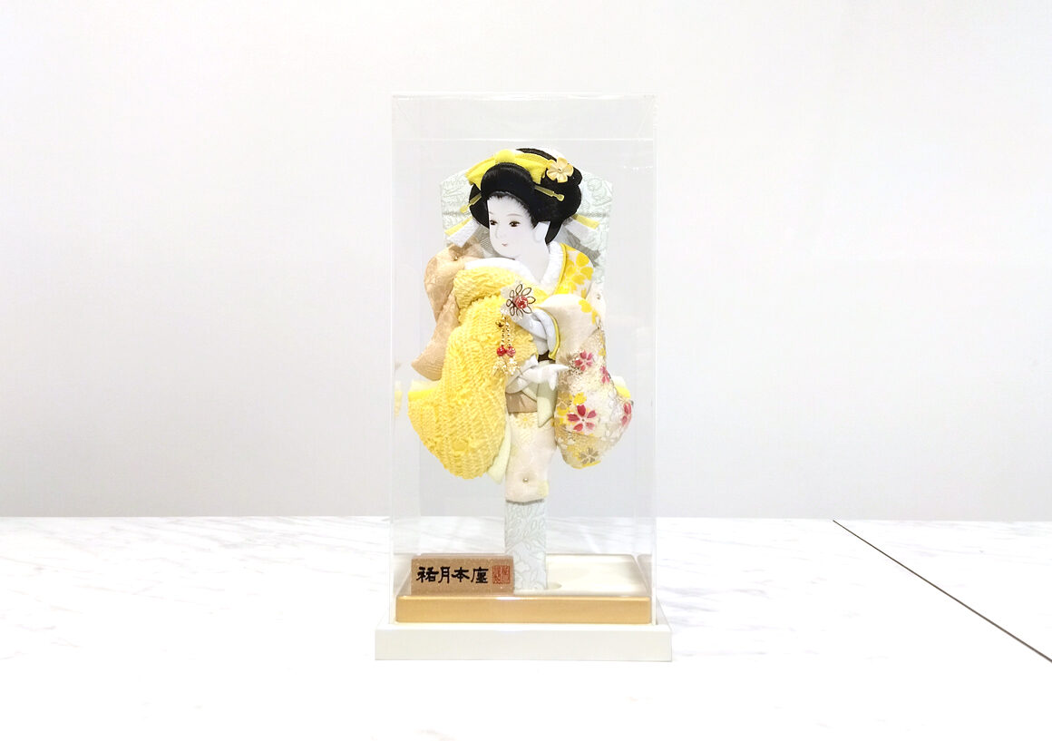 絞り染めの御衣裳は正絹生地を使用、コンパクトなアクリルケース入りで様々な場所に飾れます。黄色は幸運や希望を象徴し、お子様の初正月のお祝いにふさわしい飾りです。