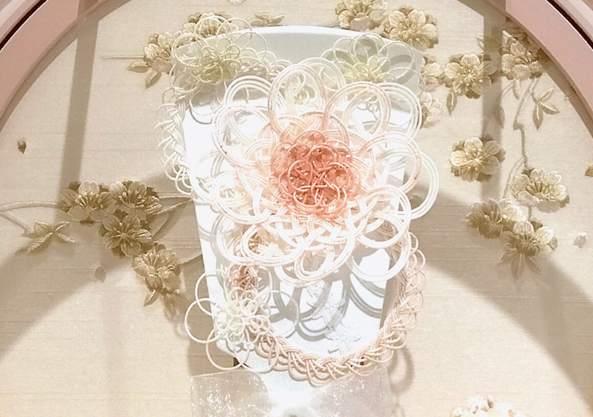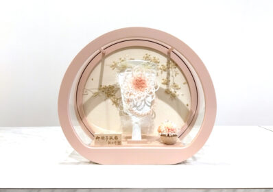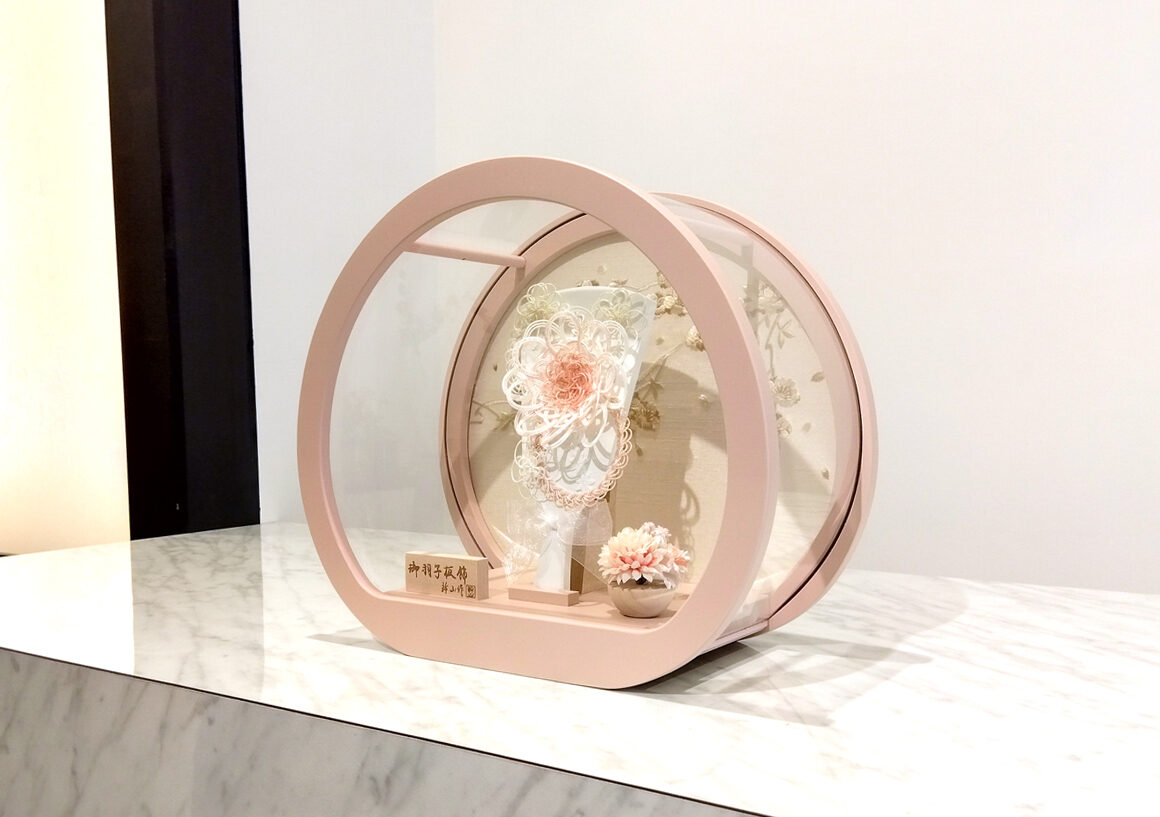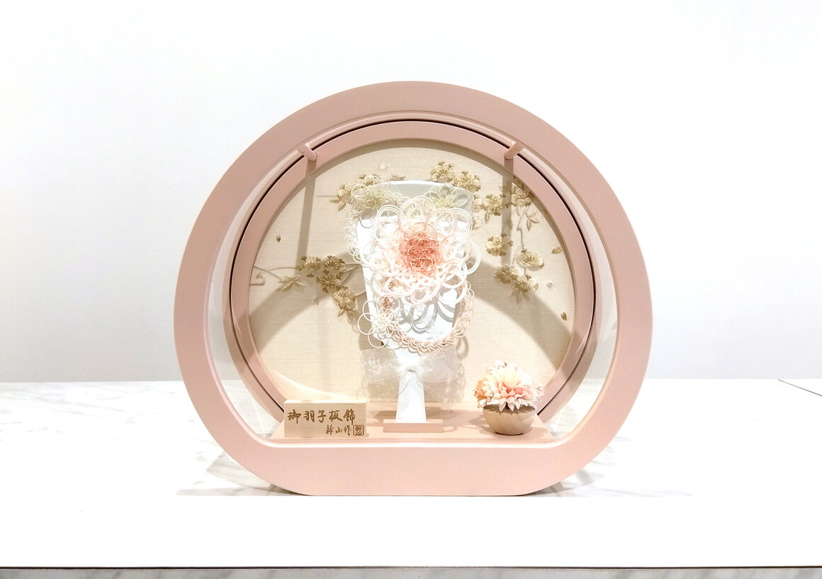 水引のお花を使用し丸型のケースに合わせたモダンな雰囲気漂う羽子板です。引は魔除けと人と人とを結びつけるという意味合いがあり縁起の良い飾りとなっています。丸く優しいピンク色のケースが白を基調とした羽子板がマッチしとても可愛らしい飾りとなっています。