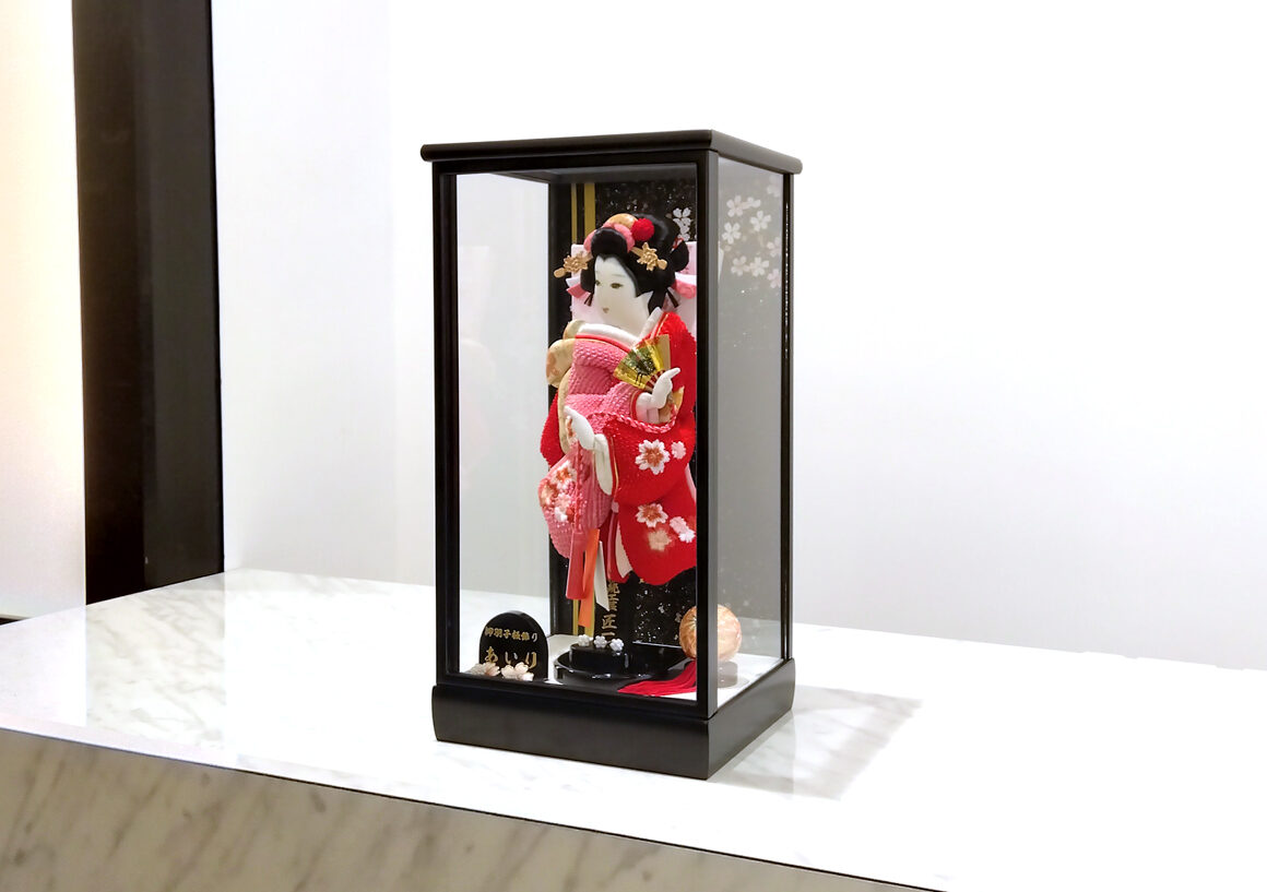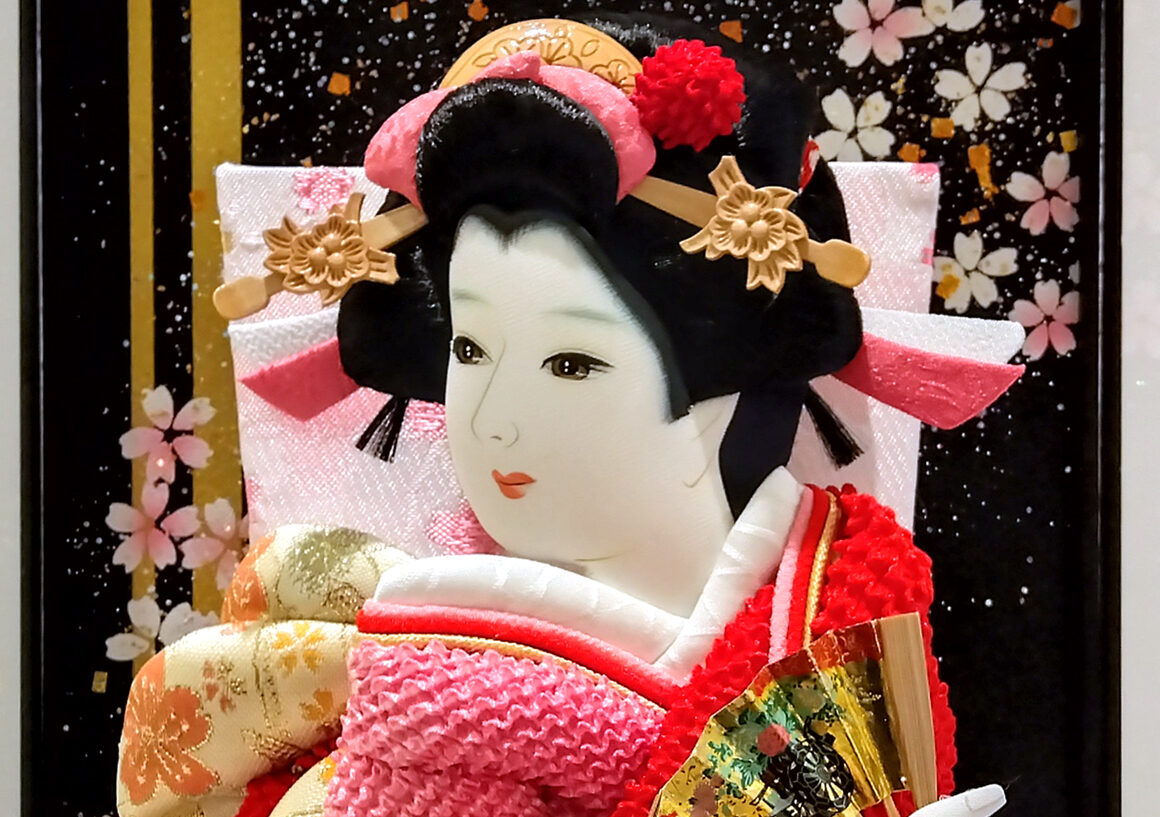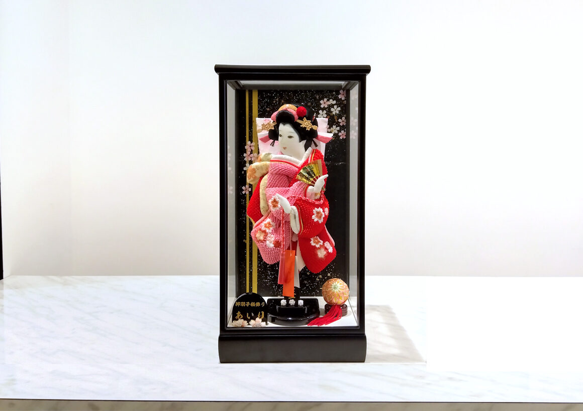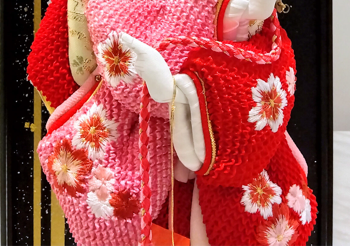 正絹鹿の子を用いた総絞りの羽子板です。色鮮やかな赤とピンクに絞り染めの柔らかな質感が加わりとても可愛らしい羽子板になっています。桜が描かれたスタイリッシュな黒塗りケースが鮮やかな羽子板を一層引き立てます。