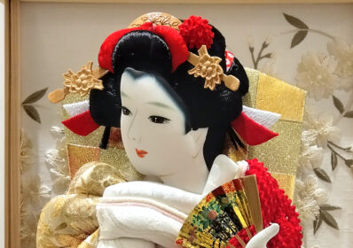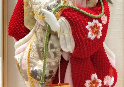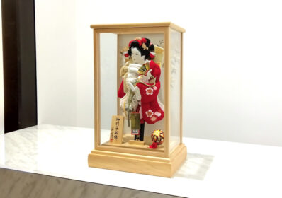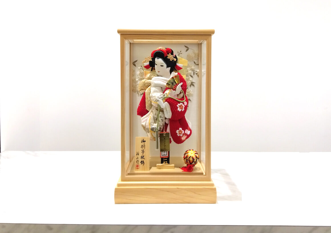 鮮やかで縁起の良い紅白の衣装が初正月のお祝いにぴったりな羽子板です。衣裳は、正絹の鹿の子絞りに可愛らしい桜の刺繍が施されており、品格と可愛らしさを兼ね備えています。ナチュラルな白木のケースが鮮やかな羽子板より際立たせます。