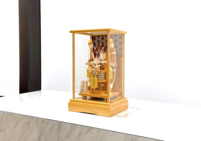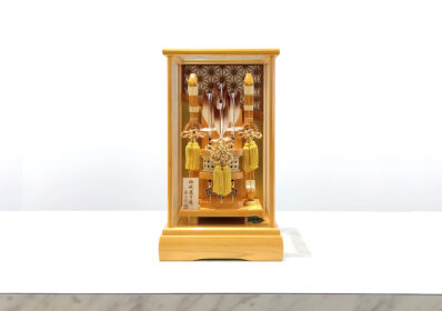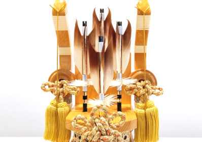 総檜造りになっており、神棚のような荘厳な雰囲気を漂わせる上品な破魔弓です。背景には縁起物の麻の葉模様が組子細工で施されており、気品ある破魔弓を一層引き立てます。