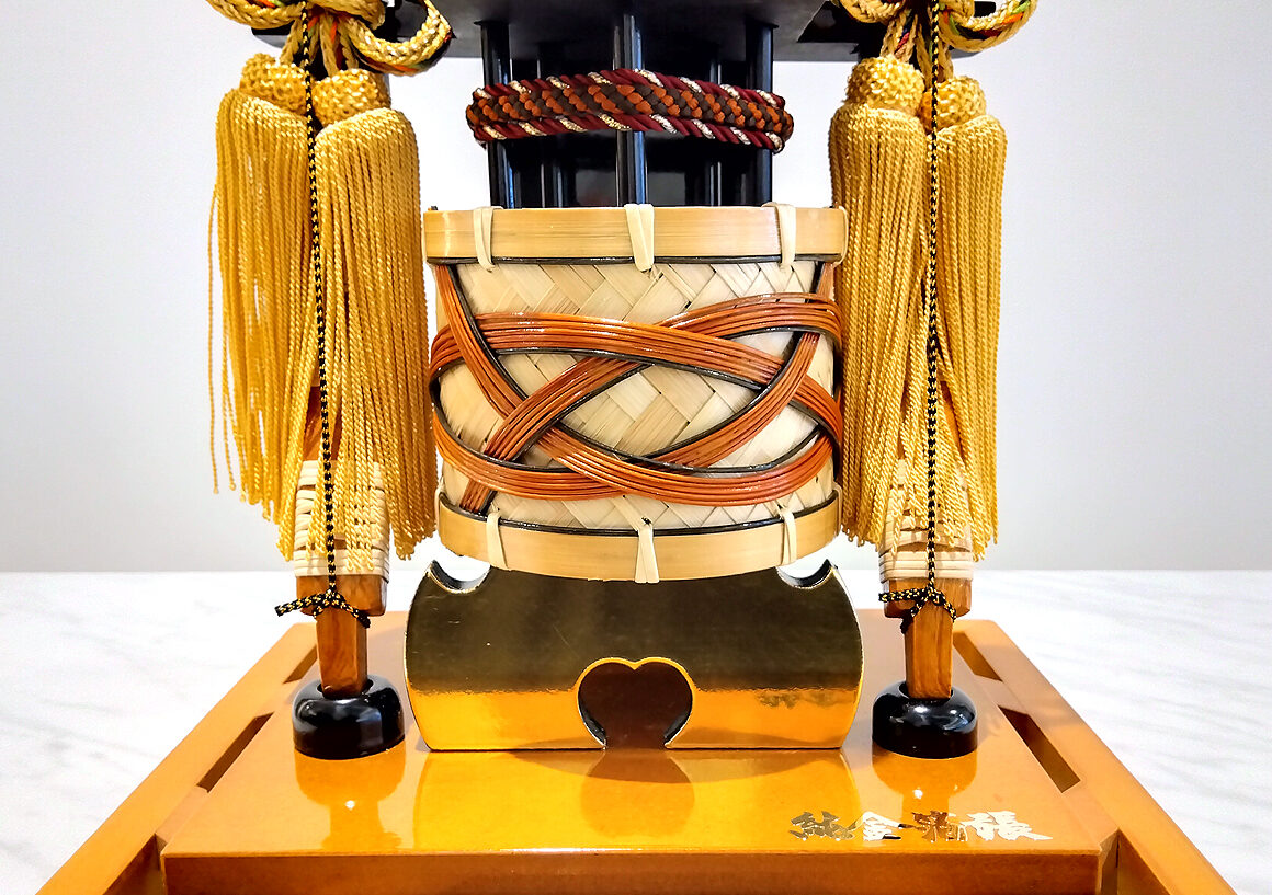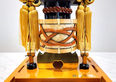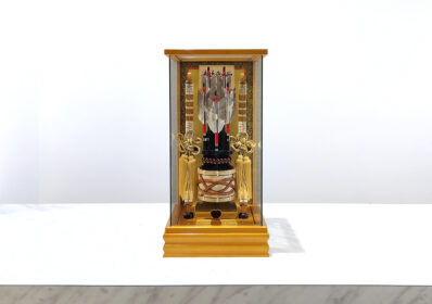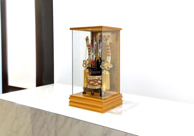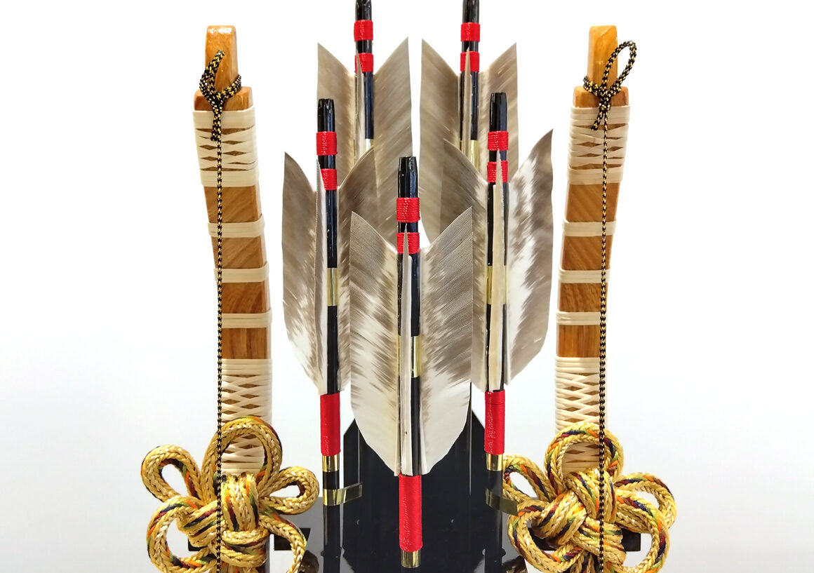 柱のないパノラマケースがスマートな破魔弓です。中央の矢の鏃は職人の手による純金箔押が施されており、重厚な輝きを放つ気品あふれる逸品です。