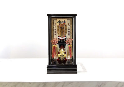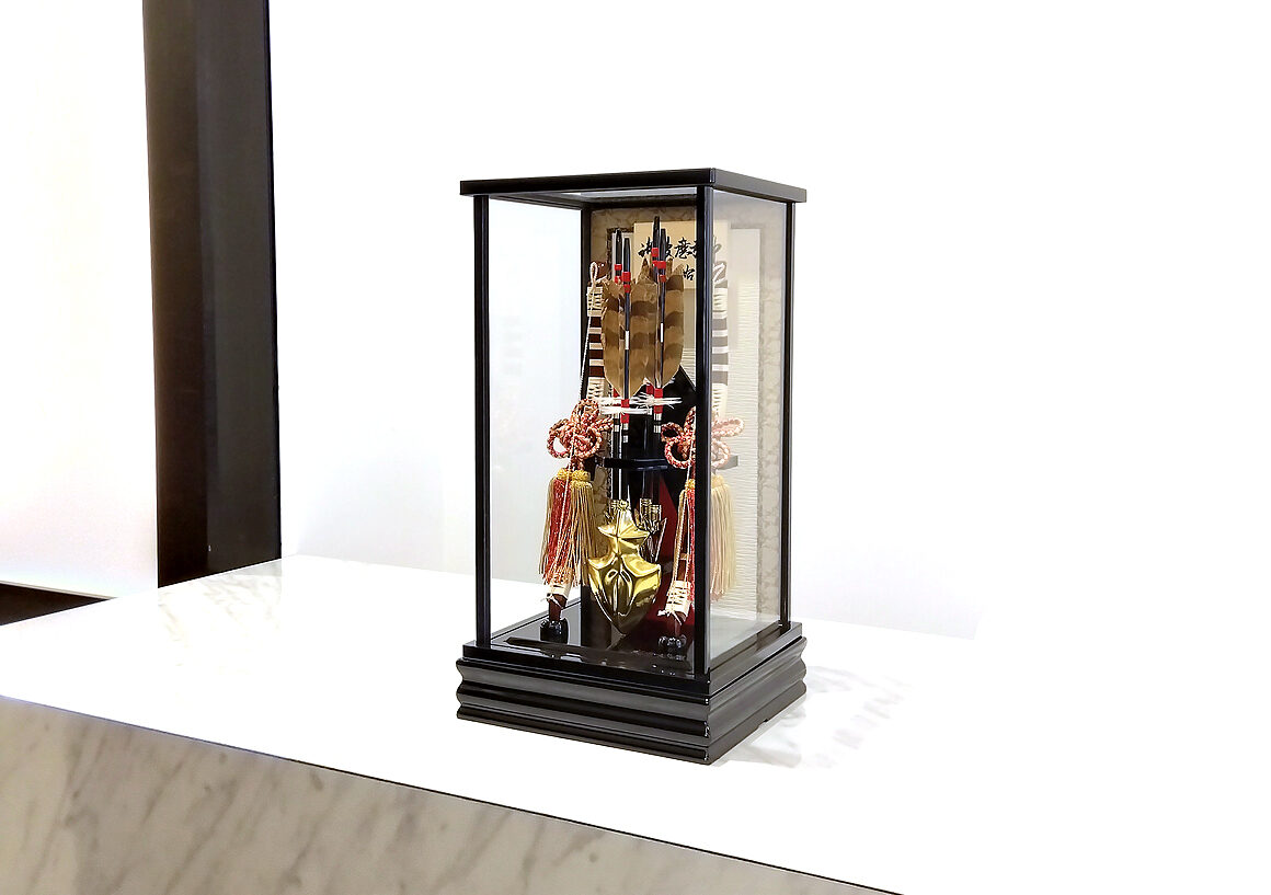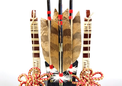 中央の大きな鏃は純金箔によって箔押され、矢には縁起の良いふくろうの羽根を使用されるなど、高級感溢れる破魔弓となっています。