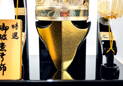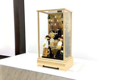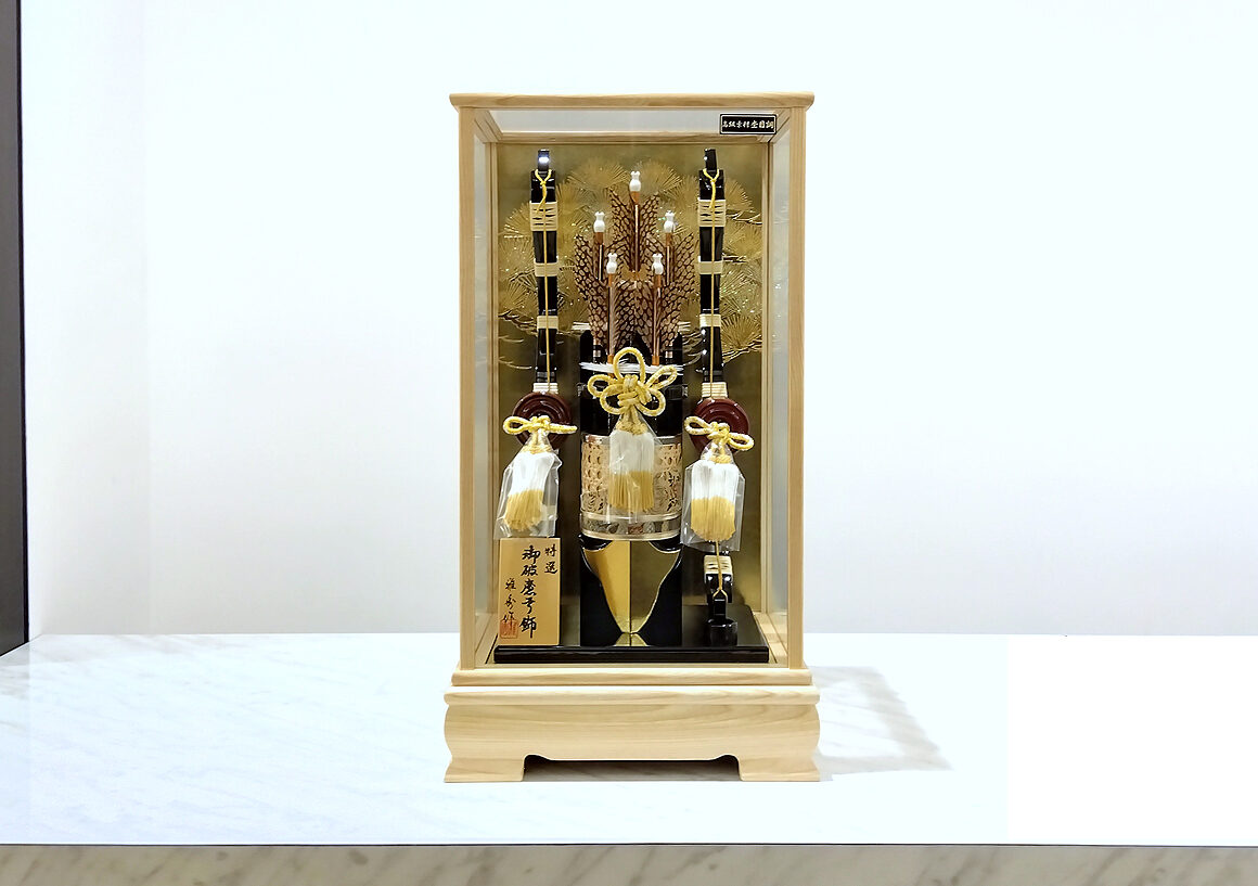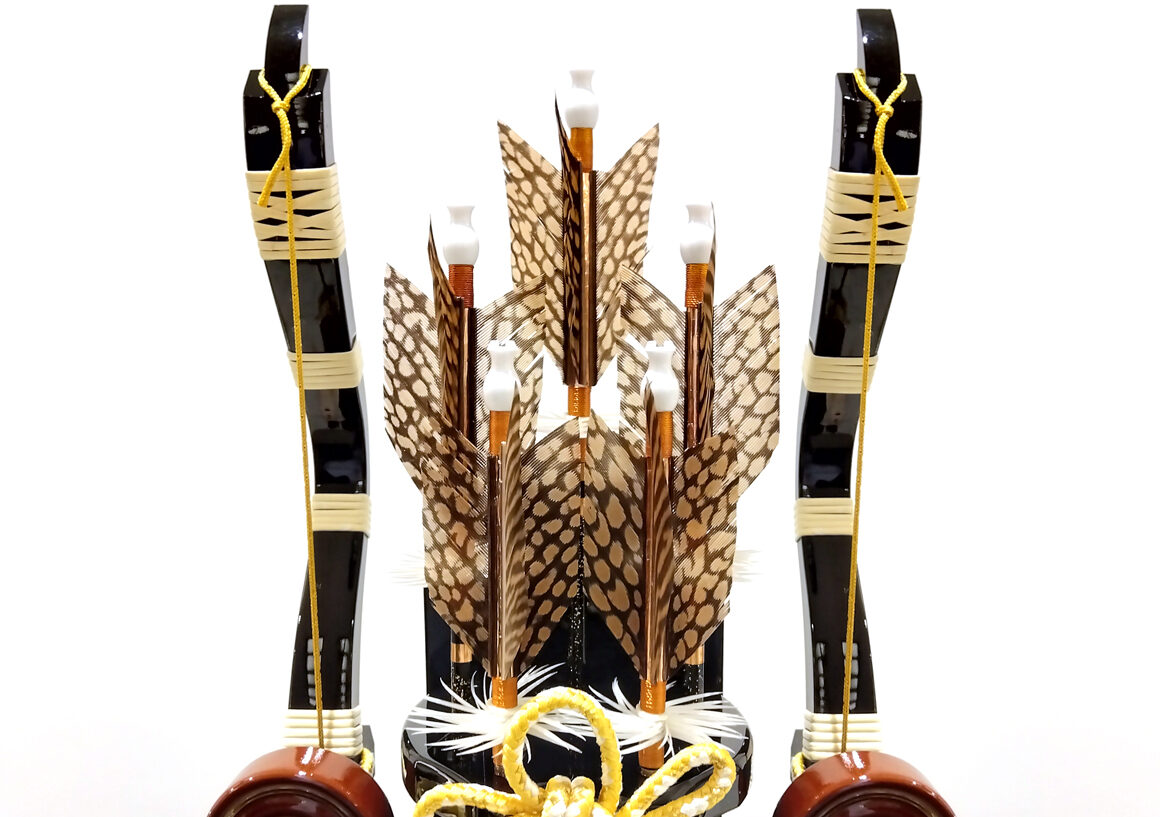 白木と金の組み合わせが華やかで気品あふれる破魔弓です。金色の背景には金松が描かれており破魔弓を豪華に彩ります。白木のケースは神棚のような荘厳さを破魔弓にプラスしています。