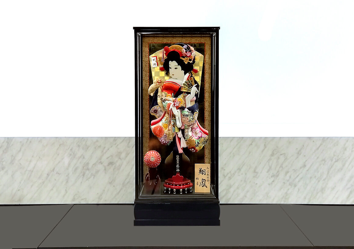 御衣裳を埋め尽くさんばかりの見事な刺繍の施された羽子板です。数十色の糸を使用し色とりどりの桜・菊・松が描かれており非常に華々しい豪華な羽子板となっています。