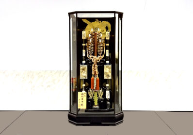 重厚で迫力ある六角ケースと中央に添えられた大きな太刀が特徴的な破魔弓です。