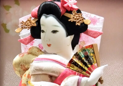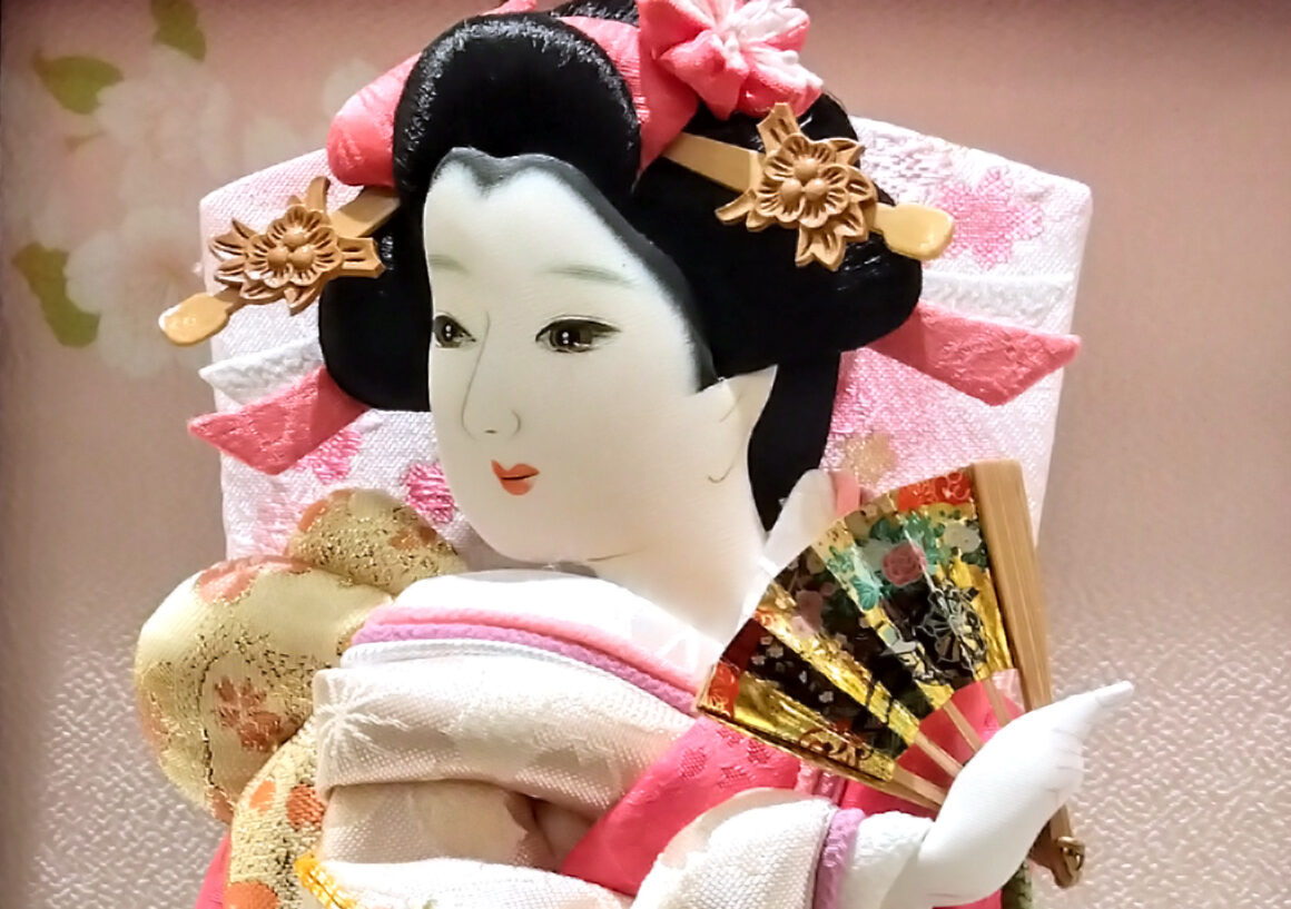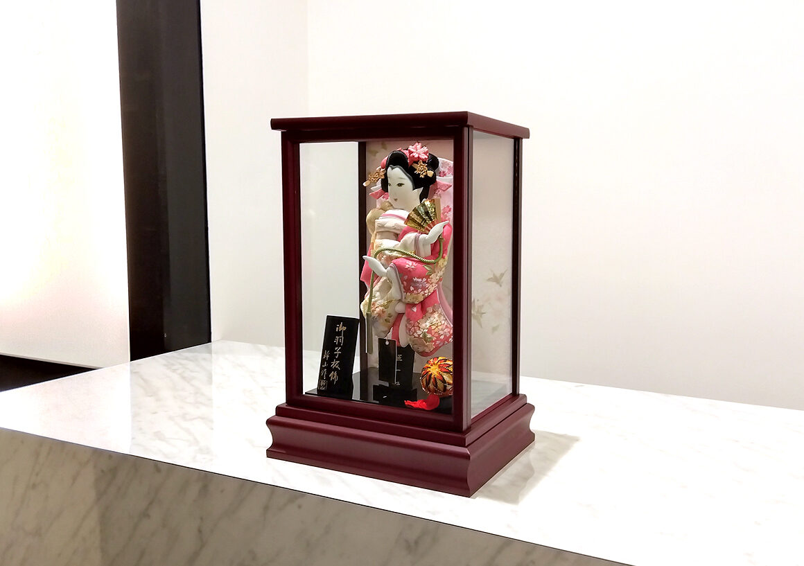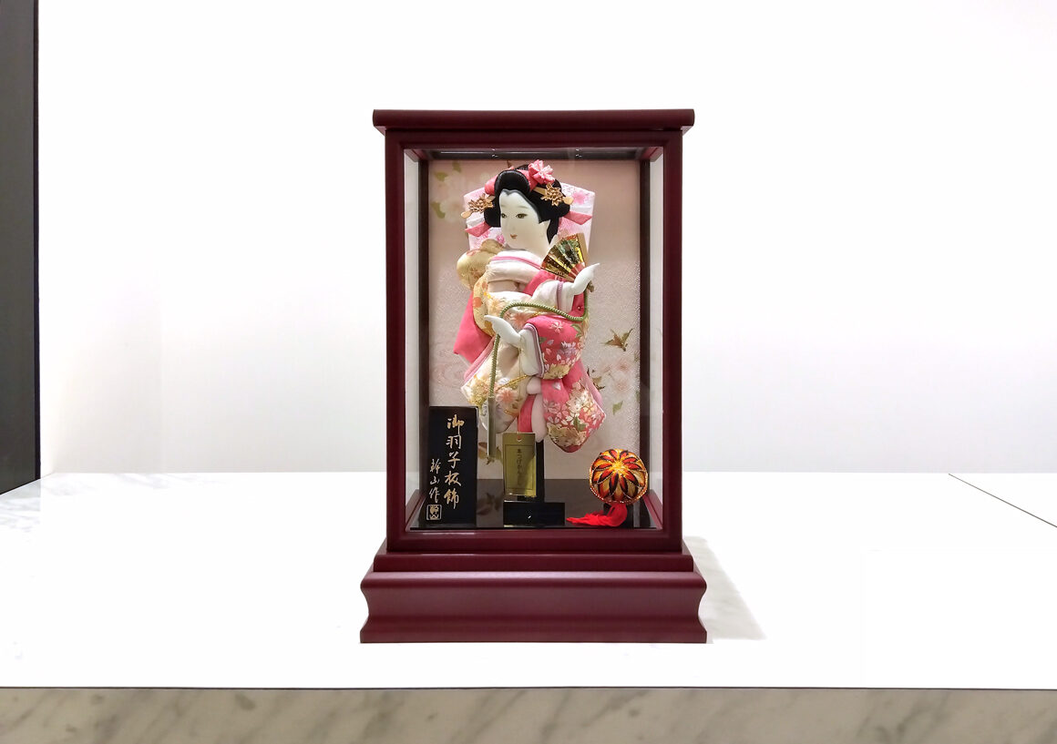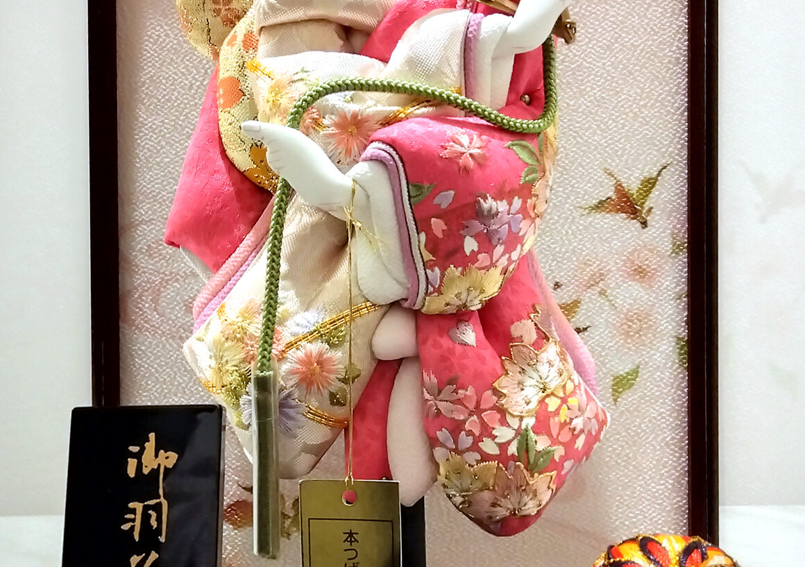 優しい色合いの御衣裳には色とりどりの桜の刺繍が散りばめられた可愛らしい羽子板です。