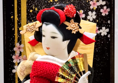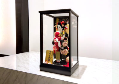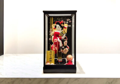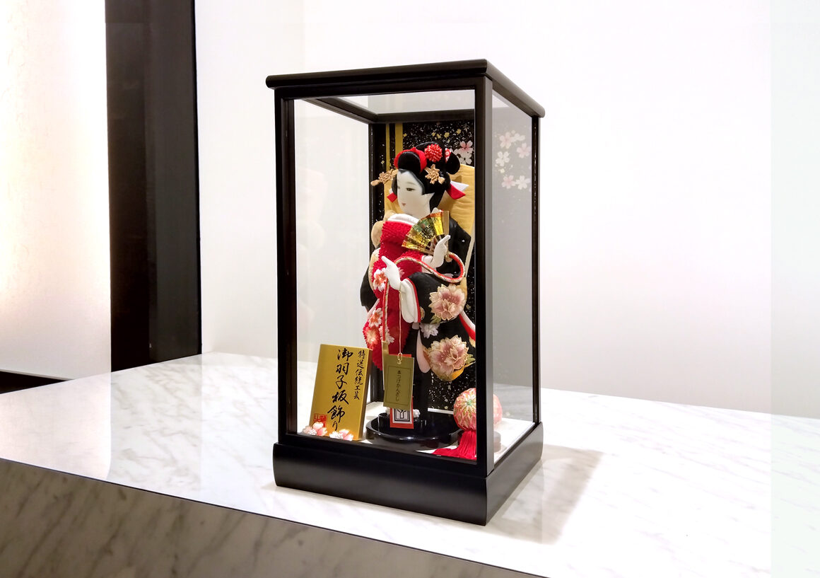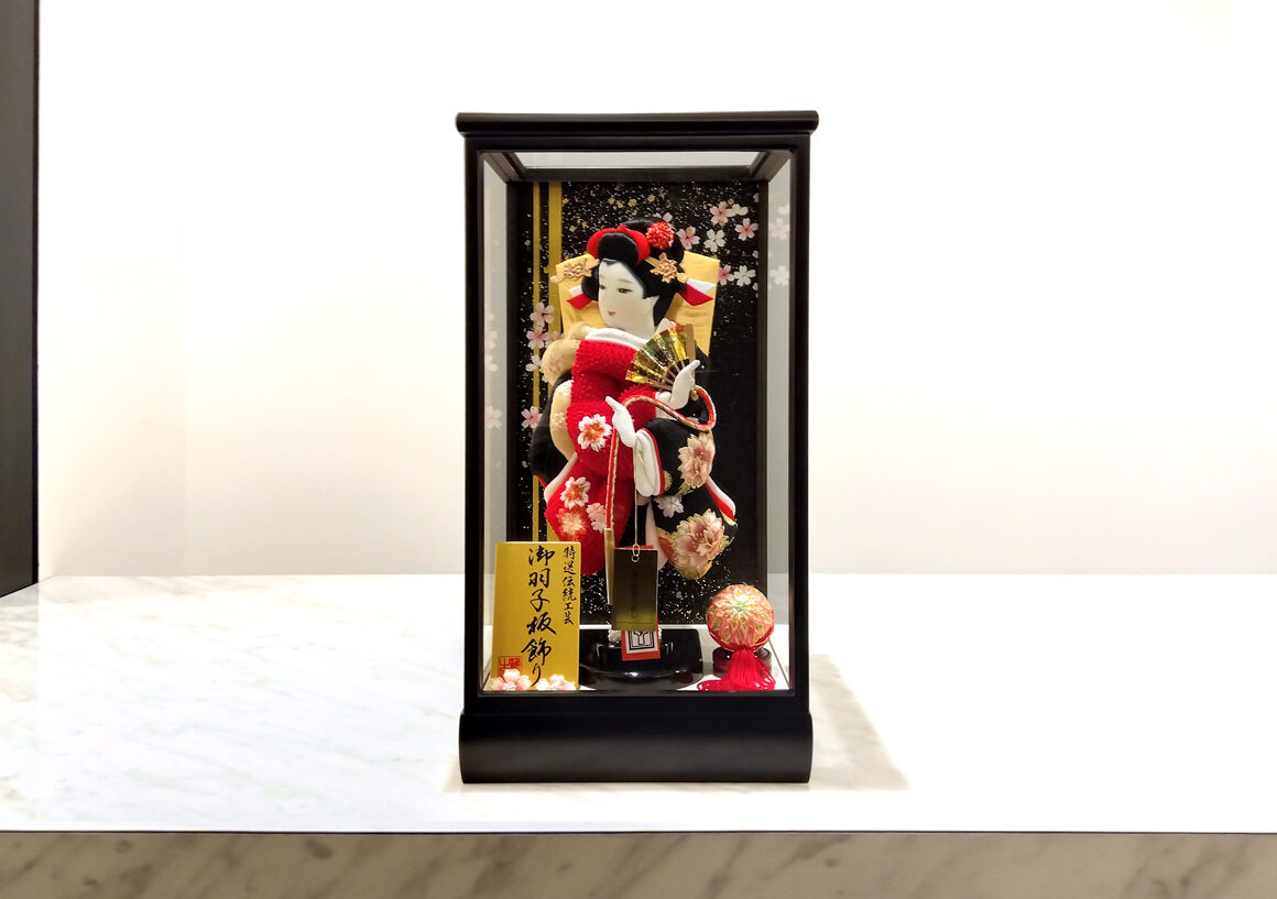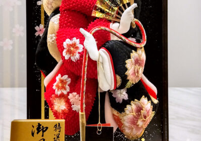 正絹鹿の子を用いた色鮮やかな赤の絞り染めと落ち着いた黒の御衣裳には美しく大きな牡丹と桜の刺繍が施され、スタイリッシュな羽子板となっています。