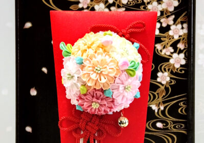 正絹のつまみ細工を贅沢に使用し大きく丸く形作られた久寿玉が華やかな羽子板です。羽子板、久寿玉共に無病息災のお守りとされ、女の子の初正月のお祝いとこれからの一年の健やかなご成長を願うとても縁起の良い羽子板となっています。
