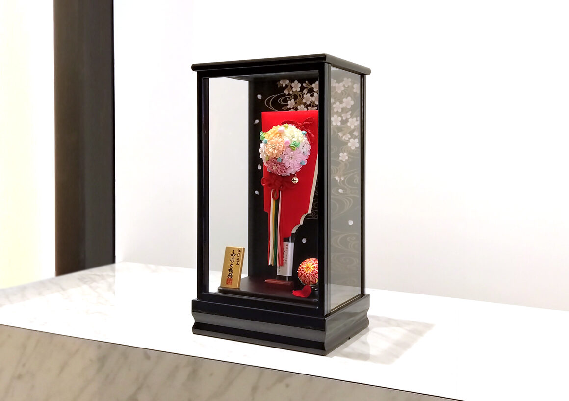 正絹のつまみ細工を贅沢に使用し大きく丸く形作られた久寿玉が華やかな羽子板です。羽子板、久寿玉共に無病息災のお守りとされ、女の子の初正月のお祝いとこれからの一年の健やかなご成長を願うとても縁起の良い羽子板となっています。