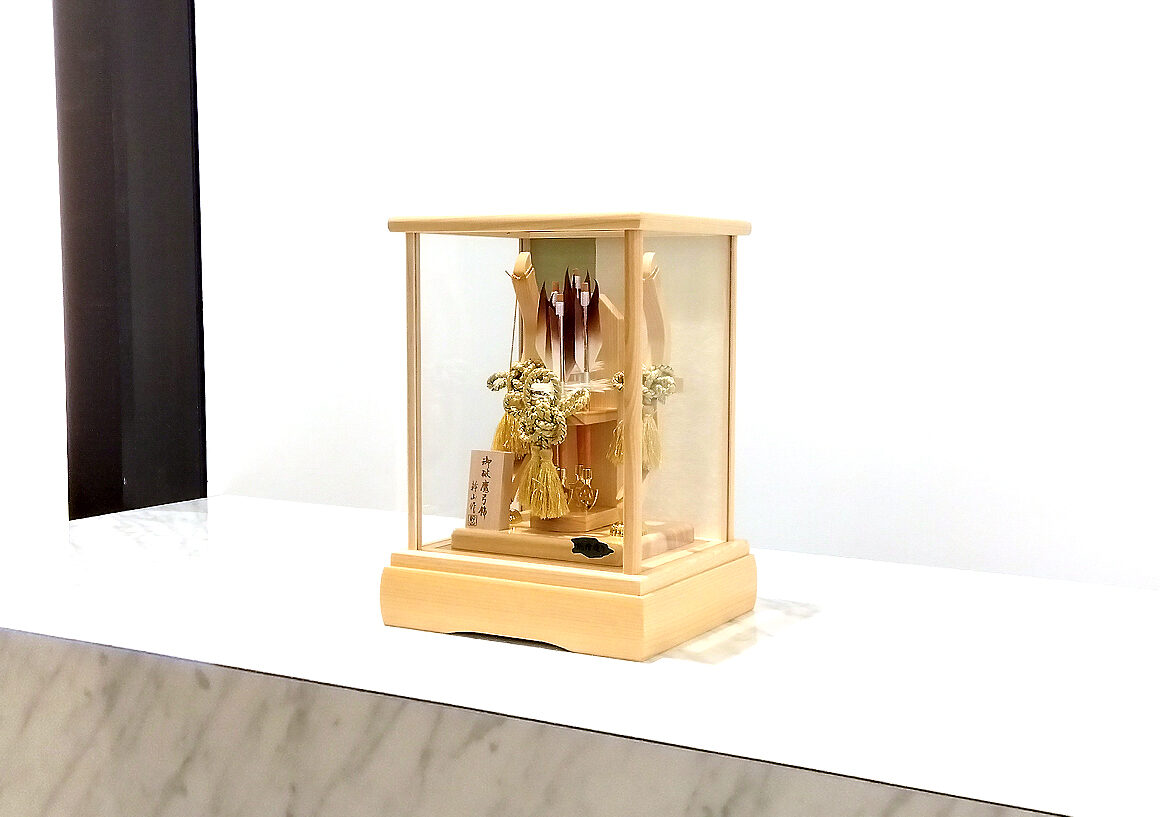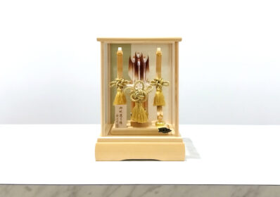 上品な明るさが特徴の総檜造りの破魔弓です。コンパクトで檜と背景のモスグリーンの淡い色使いが和洋お部屋を問わずお飾りいただけます。