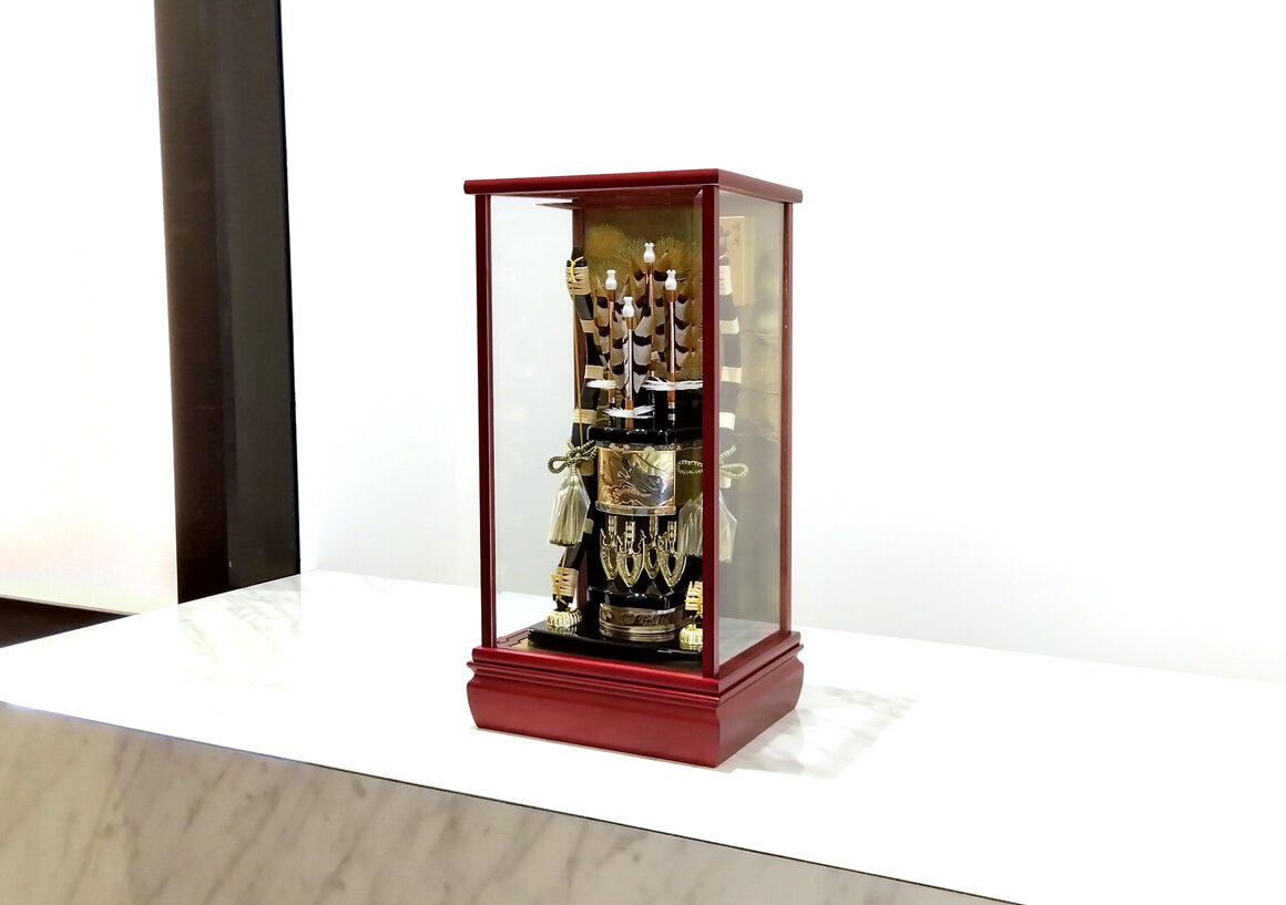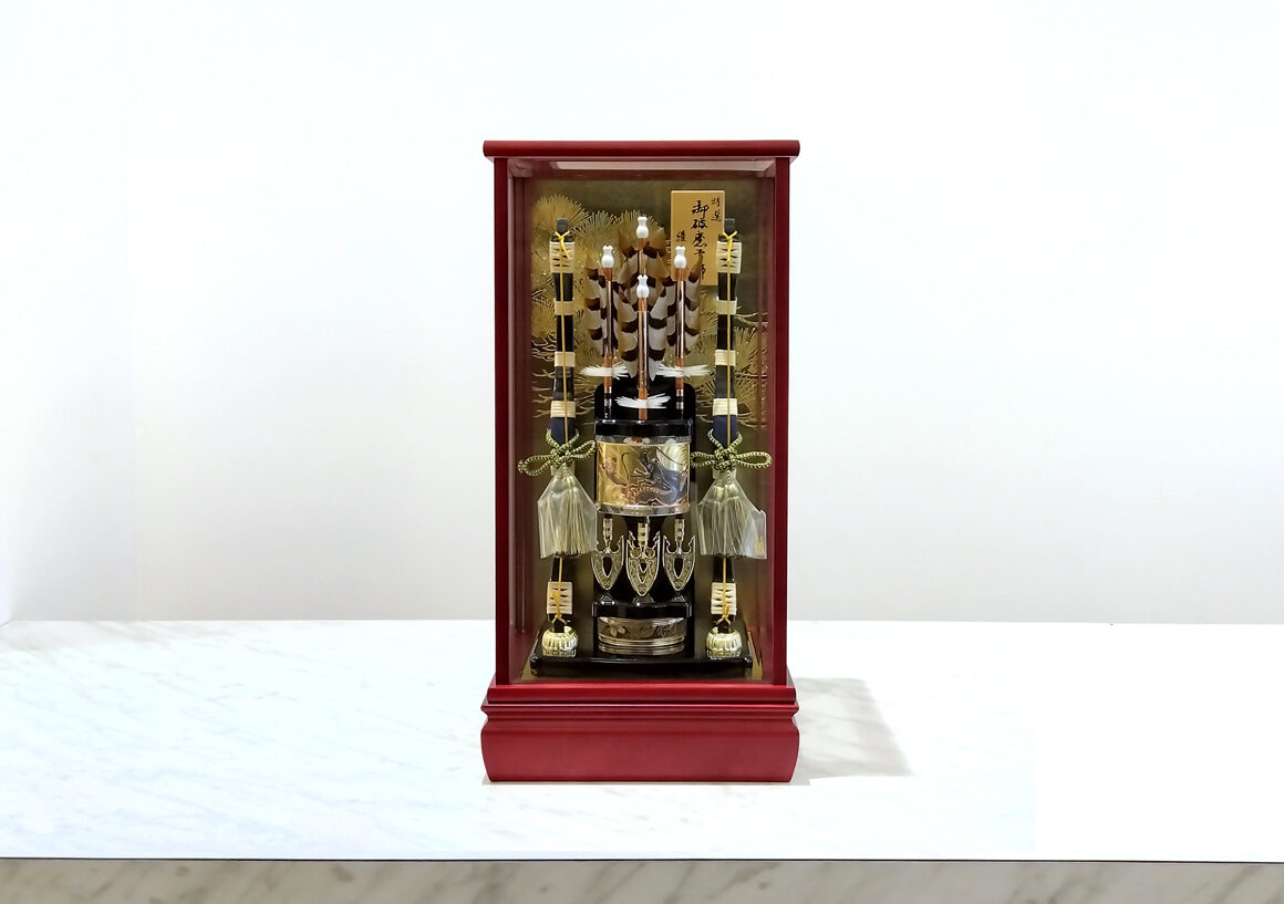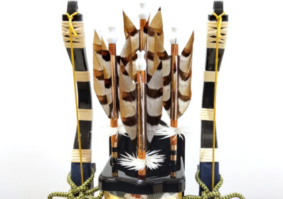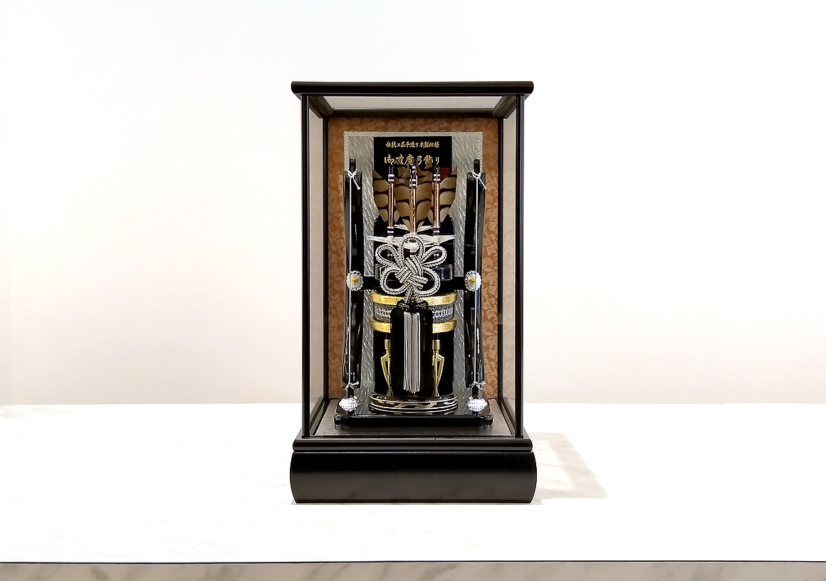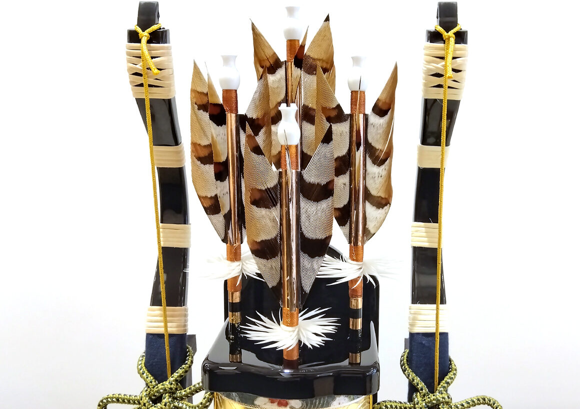 煌びやかな背景の金松と中央の龍を象った彫金細工が美しい破魔弓です。龍は出世祈願や運気上昇のシンボルでもあり、邪気や厄災を払い守ってくれるお守りでもあります。