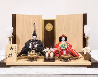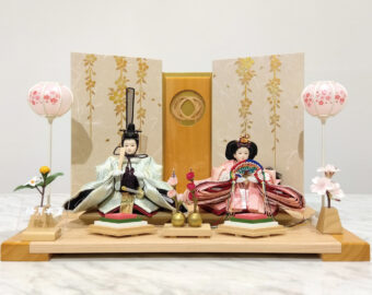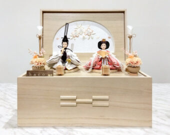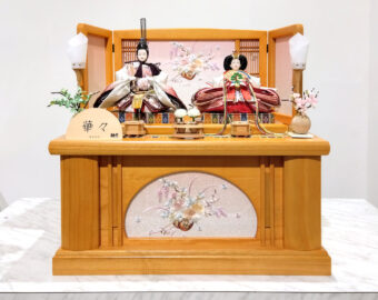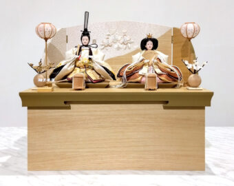 豪華な金色の雪輪桜が美しく刺繍されたお人形は、洋間にもぴったり。ナチュラルな白木調の収納台との組み合わせが、上品な雰囲気を醸し出します。収納台の蓋だけを使い、平飾りとしても楽しめるのもポイントです。