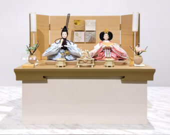 青とピンクの衣装が爽やかな印象を与えるこの飾りは、洋間をはじめどんなお部屋にも調和します。白と白木調の収納台はシンプルでありながら高級感があり、一層の華やかさを演出してくれます。さらに、収納台の蓋のみで飾ることで高さを押さえた平飾りとして飾ることも可能。空間に合わせてお飾りいただけます。