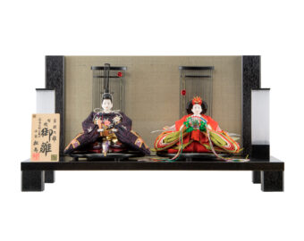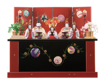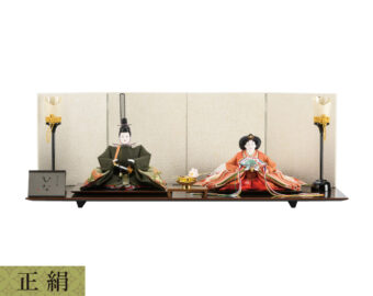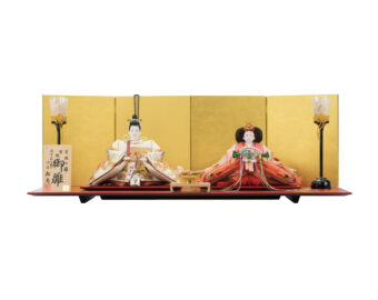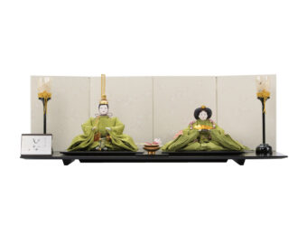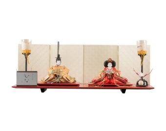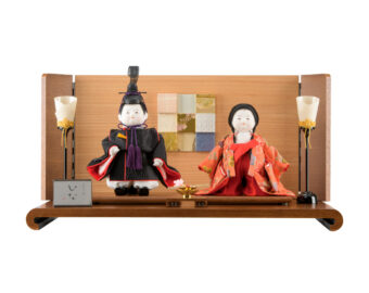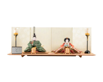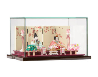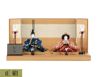 青とピンクの衣装が爽やかな印象を与えるこの飾りは、洋間をはじめどんなお部屋にも調和します。白と白木調の収納台はシンプルでありながら高級感があり、一層の華やかさを演出してくれます。さらに、収納台の蓋のみで飾ることで高さを押さえた平飾りとして飾ることも可能。空間に合わせてお飾りいただけます。