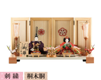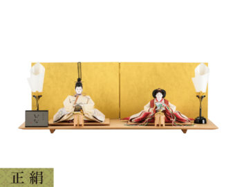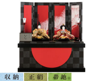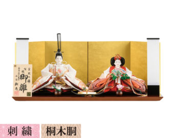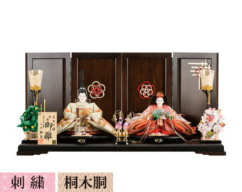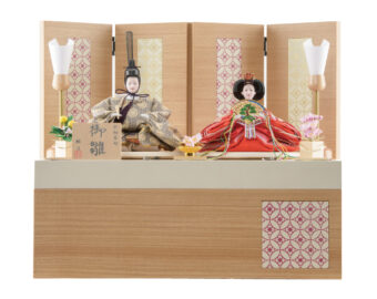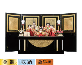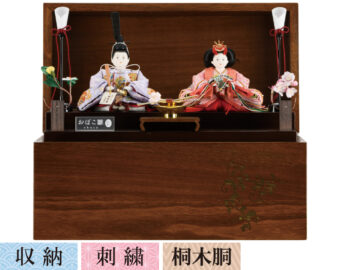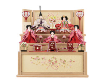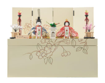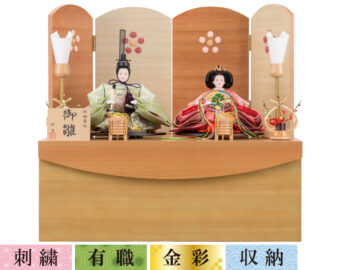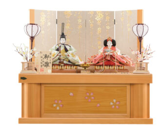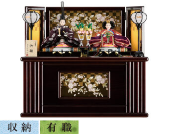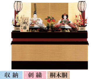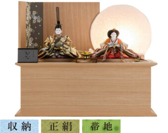 豪華な金色の雪輪桜が美しく刺繍されたお人形は、洋間にもぴったり。ナチュラルな白木調の収納台との組み合わせが、上品な雰囲気を醸し出します。収納台の蓋だけを使い、平飾りとしても楽しめるのもポイントです。