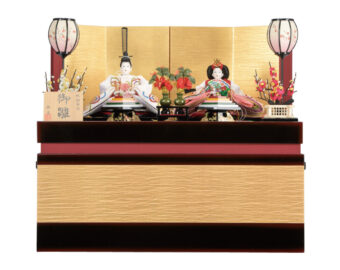 白の衣装に金色の華やかな華紋と唐草が描かれたお雛様です。色鮮やかでまるで漆器のような高級感溢れる塗りの収納台が特徴的で、華やかなお雛様を一層引き立てます。