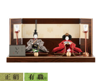格調高く縁起の良い吉祥の有職文様の御衣裳のお雛様でお子様の初節句にぴったりです。明るく優しい風合いの飾り台はお雛様を収納でき、コンパクトにしまえ、和洋お部屋を問わずお飾りいただけます。