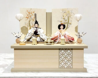 落ち着いた雰囲気のグレーとピンク色が調和した、桜と牡丹が美しく刺繍されたお雛様です。白木とグレーを基調とした収納台が上品な雰囲気を醸し出し、お部屋のインテリアに華を添えます。