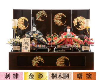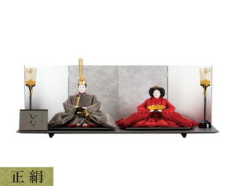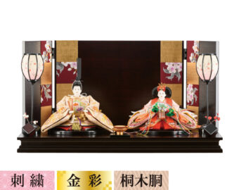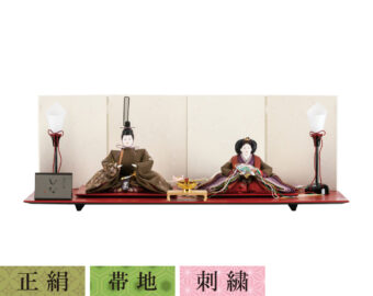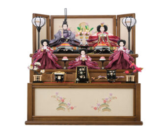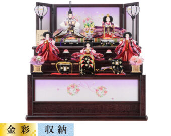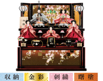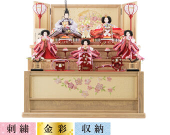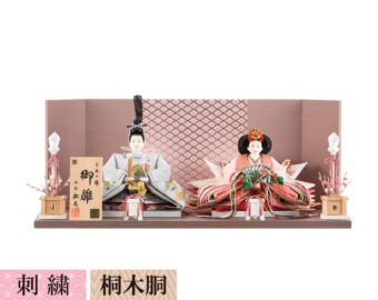落ち着いた雰囲気のグレーとピンク色が調和した、桜と牡丹が美しく刺繍されたお雛様です。白木とグレーを基調とした収納台が上品な雰囲気を醸し出し、お部屋のインテリアに華を添えます。