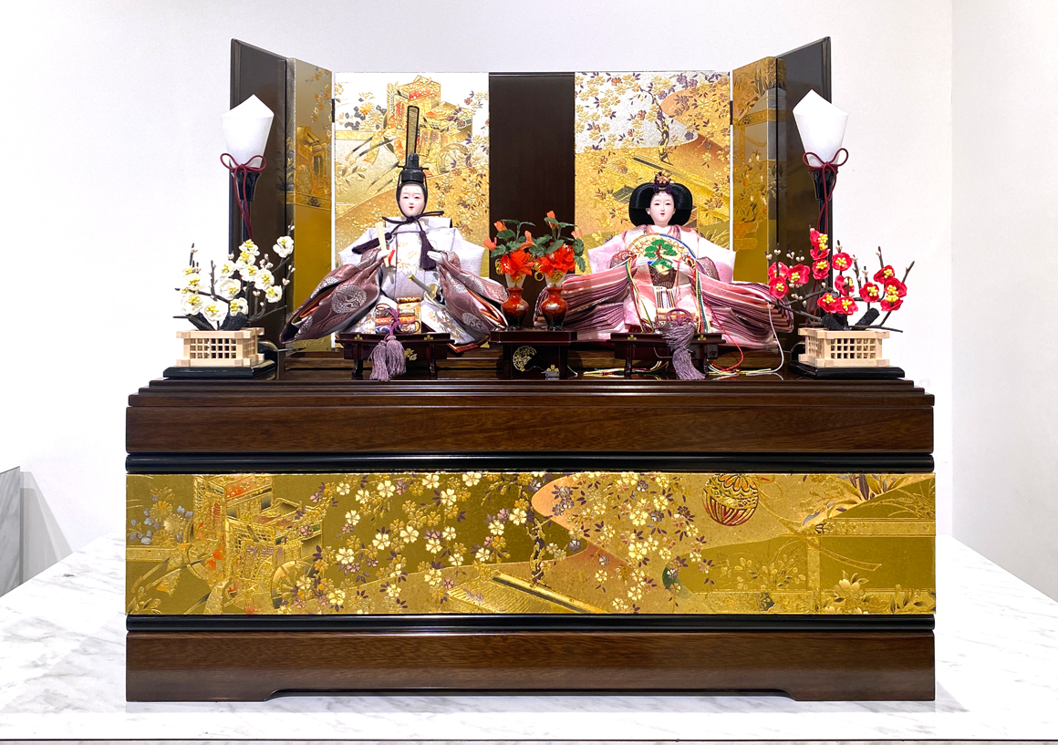 お人形、飾り台ともに白を基調としたモダンなデザインになっており、リビングなどの洋間にもぴったりと合うお雛様となっています。随所に刺繍で入れられた桜が女の子のお節句にふさわしい可愛らしいお雛様です。