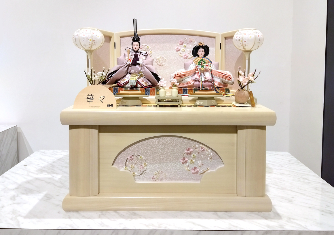 霞桜が刺繍されたベージュの御衣裳には桜の若葉を思わせる重ねの緑色がアクセントになっており、白木の優しい色調の飾り台とあわせ春の暖かさを感じさせるようなお雛様です。
