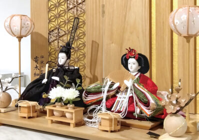 吉祥文様の雲立涌が描かれた色鮮やかなお雛様で日本の伝統美と現代の洗練されたデザインが融合した一品です。ナチュラルな白木調の飾り台が優美さを引き立て、屏風台には麻の葉の組子細工と寄木細工が贅を尽くしています。