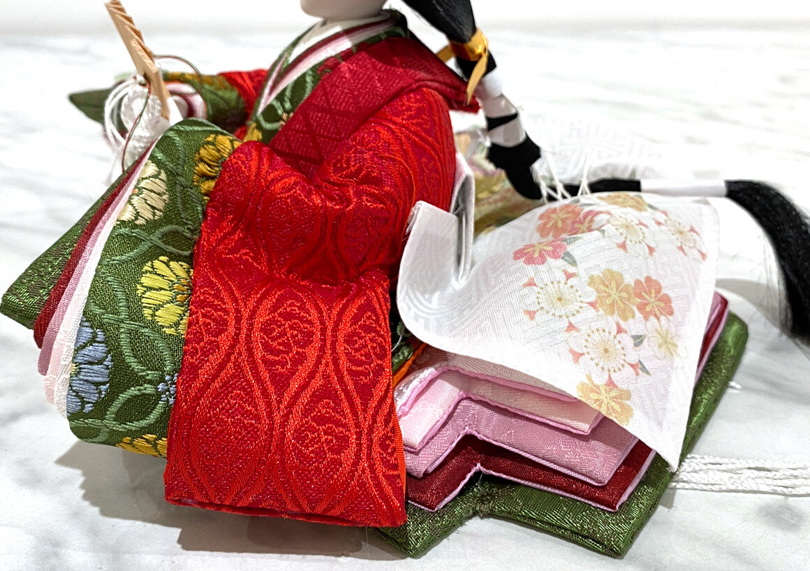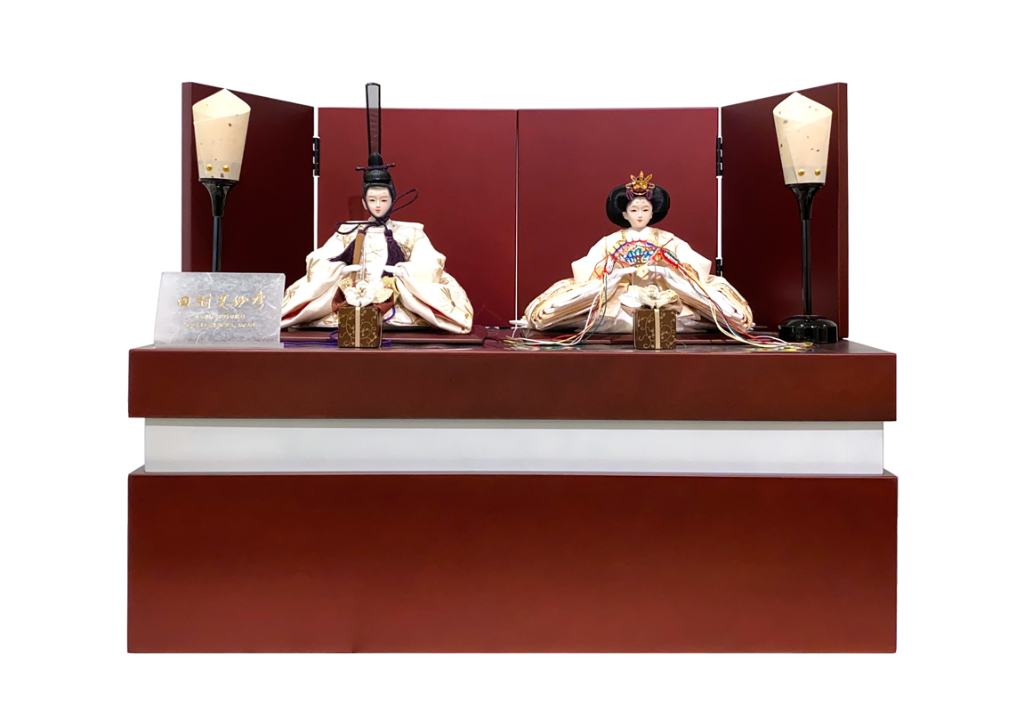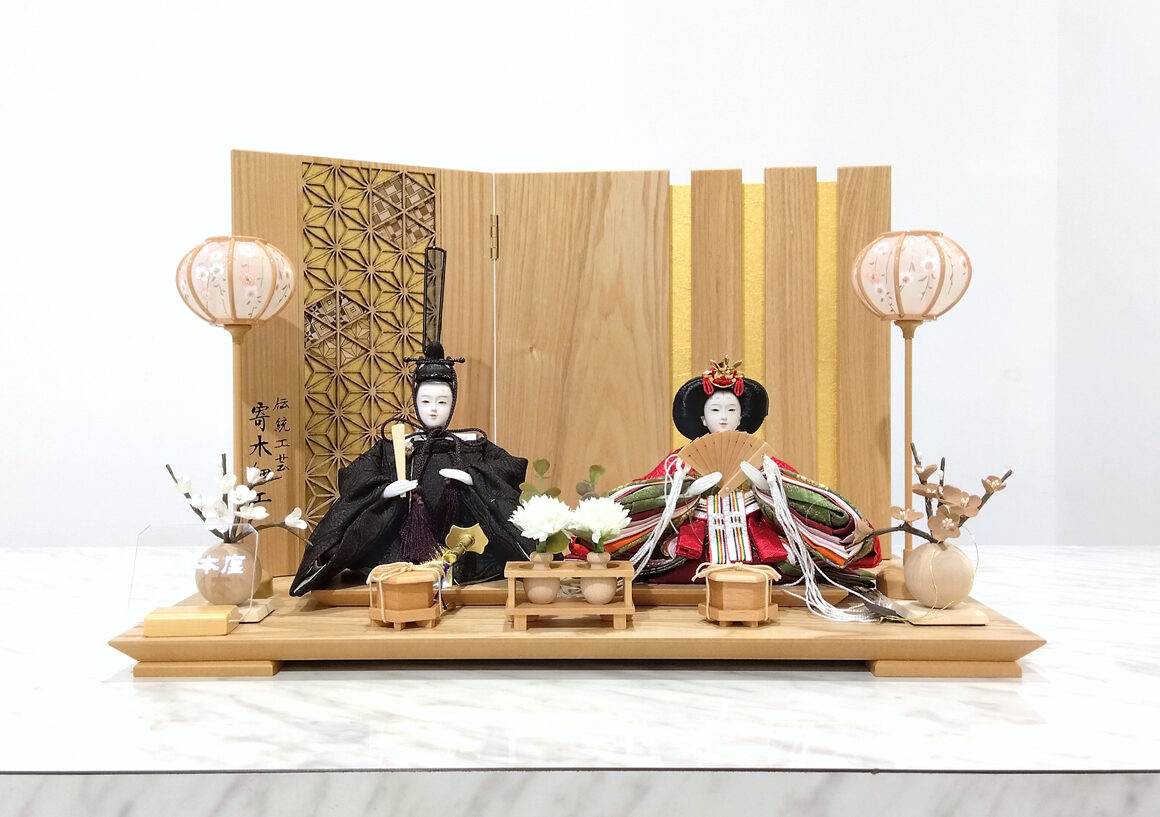 吉祥文様の雲立涌が描かれた色鮮やかなお雛様で日本の伝統美と現代の洗練されたデザインが融合した一品です。ナチュラルな白木調の飾り台が優美さを引き立て、屏風台には麻の葉の組子細工と寄木細工が贅を尽くしています。