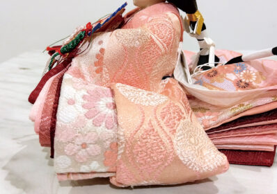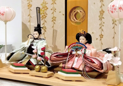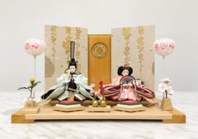春を感じさせる淡く可愛らしい色合いが特徴のお雛様です。衣装には縁起の良い鶴紋が描かれ、ナチュラルな白木調の飾り台には特徴的な千筋細工が施されています。部屋のインテリアと調和し、おしゃれで上品な雰囲気を演出します。