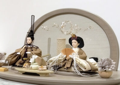 落ち着いてスタイリッシュなブラウン一色の衣装が美しいお雛様です。グレーを基調にした円型で可愛らしい飾り台が特徴で、洋間にもマッチする洗練されたデザインのお雛様になっています。