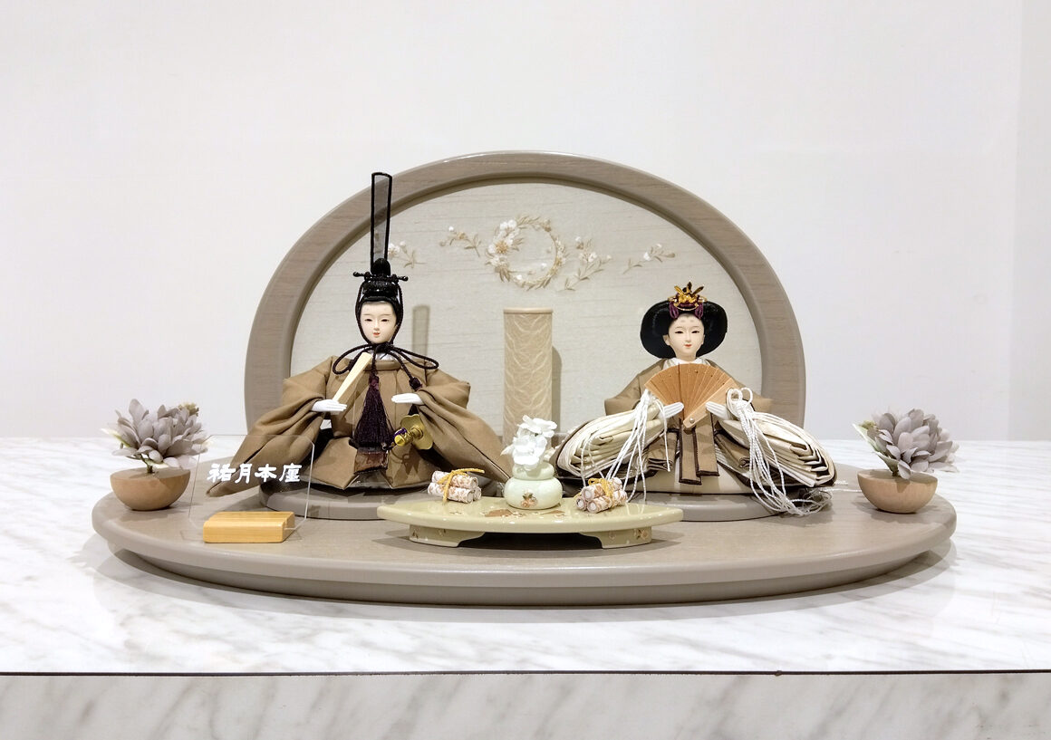 落ち着いてスタイリッシュなブラウン一色の衣装が美しいお雛様です。グレーを基調にした円型で可愛らしい飾り台が特徴で、洋間にもマッチする洗練されたデザインのお雛様になっています。