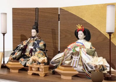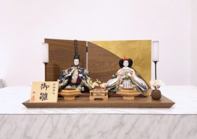 華やかで豪華な菊の文様が描かれた美しいお雛様です。木目調のスタイリッシュな飾り台と合わせ、和の趣きとモダンなデザインが見事に融合した逸品となっています。