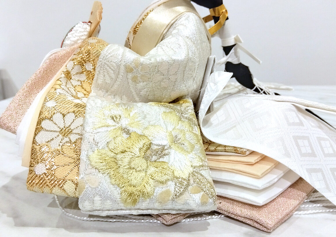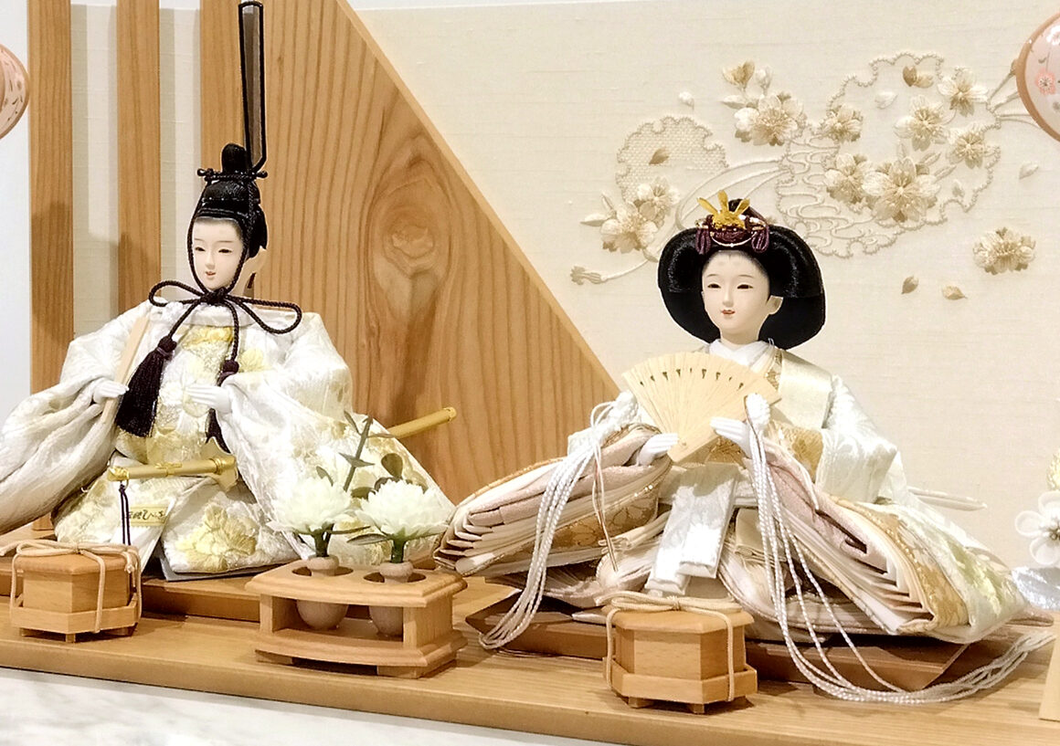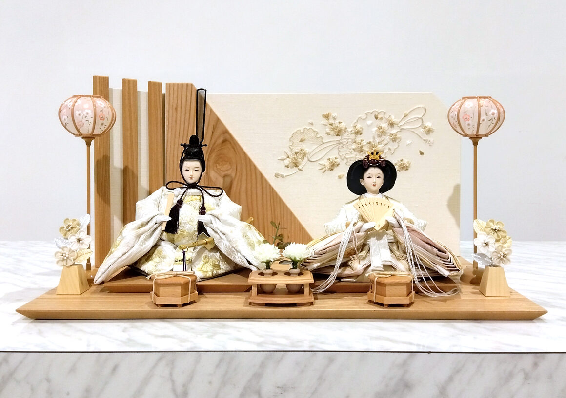 白と金を基調としたお雛様です。金色の牡丹と桜の刺繍が施された衣装は、華やかさと上品さがありお雛様を彩ります。さらに、洋間にも調和するナチュラルな白木調の飾り台がお人形を引き立て、洗練されたデザインが特徴的な飾りとなっています。